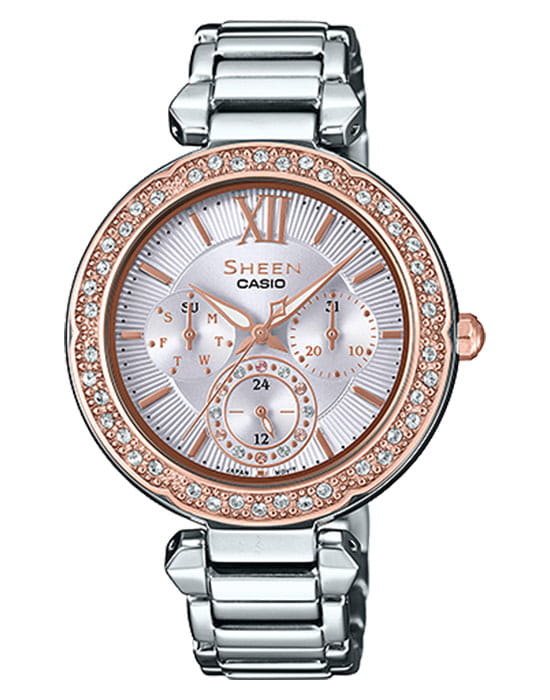 Женские японские часы Casio Sheen SHE-3061SG-4AUDR, кварцевый механизм с высокой точностью. Класс водозащиты: 50 метров, позволит защитить корпус от случайных брызг или капель дождя. Круглый стальной корпус изготовлен из нержавеющей стали. Безель с IP-покрытиемIP-покрытиеМетод ионного напыления. Демонстрирует повышенную устойчивость к истиранию, окислению и химическим веществам. Под воздействием высокого давления и температуры около 1500°C молекулы металла надёжно соединяются с частицами корпуса часов. украшенный кристаллами. Стрелки с люминесцентной подсветкойЛюминесцентное покрытиеПозволяет считывать показания времени в темноте. Производители наносят на стрелки, часовые индексы, безель или поверхность циферблата светонакопительный состав, дающий холодное свечение.. На маленьких циферблатах информация о дате. Рифленая заводная головка. Полированный стальной браслет имеет раскладывающуюся застежку.