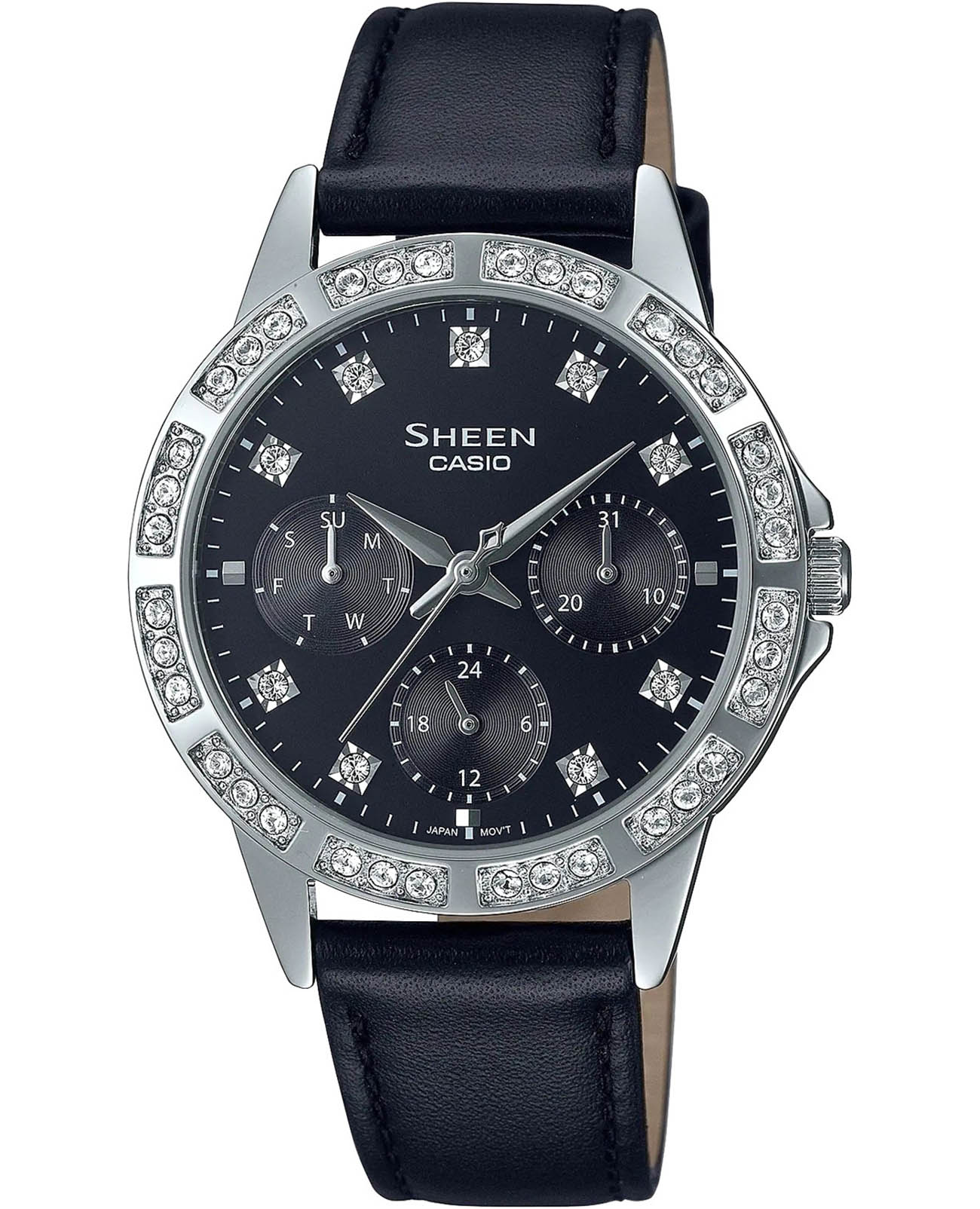 Женские японские наручные часы Casio Sheen SHE-3517L-1AUEF, кварцевый механизм с высокой точностью. Сапфировое стекло устойчивое к появлению царапин, обладающее высокой прозрачностью. Класс водозащиты: 50 метров, позволит защитить корпус от случайных брызг или капель дождя. БезельБезельВнешний ободок, закрепляющий стекло. В спортивных часах так называется поворотное кольцо с делениями на циферблате, выполняет роль таймера – замеряет отрезки времени на шкале. Неподвижный безель – элемент декора. Однонаправленно вращающийся безель на дайверских часах позволяет фиксировать моменты погружения и выныривания на поверхность. и циферблат украшены кристаллами. 24-часовой формат времени, дата и день недели отображены на отдельных циферблатах.