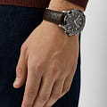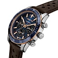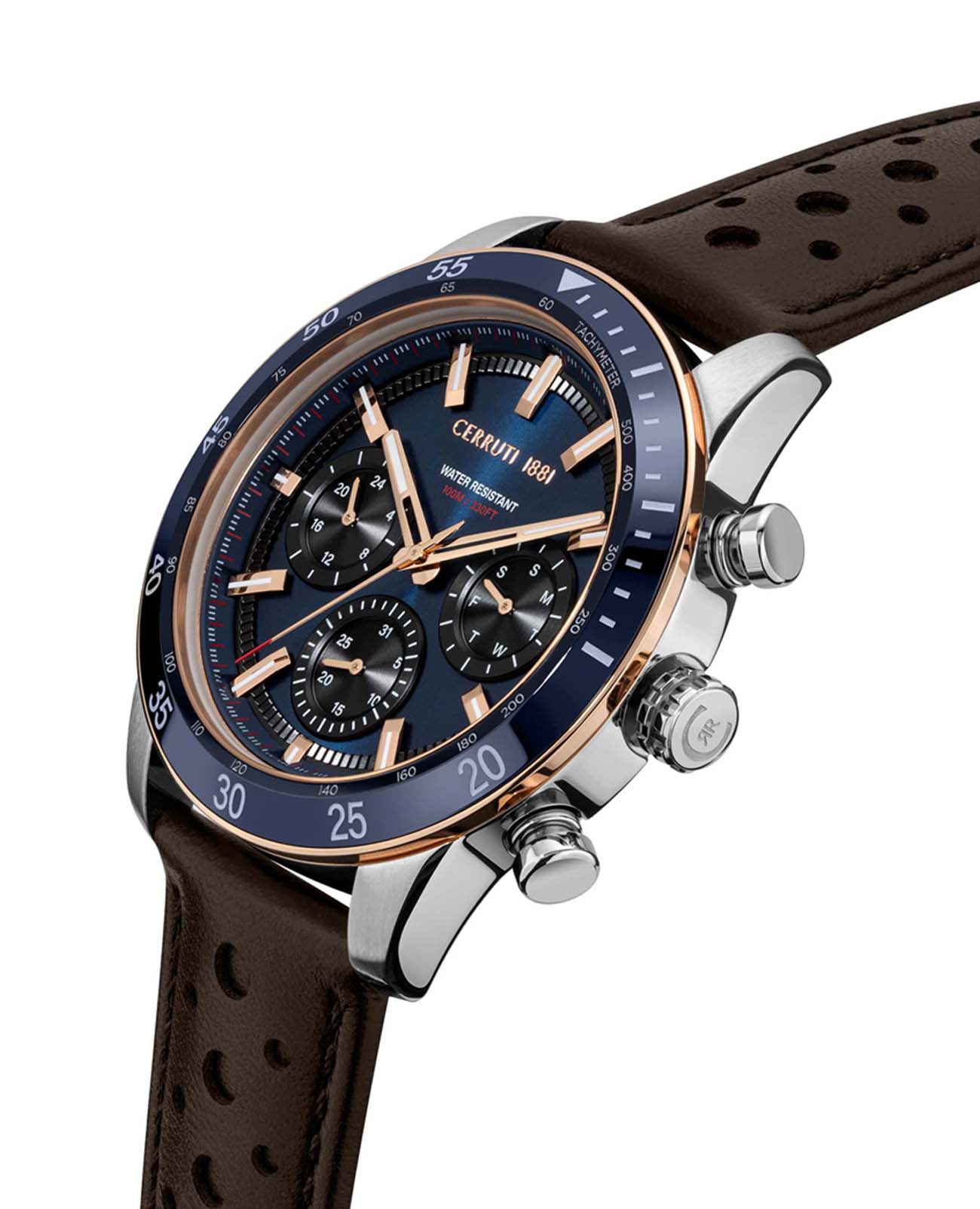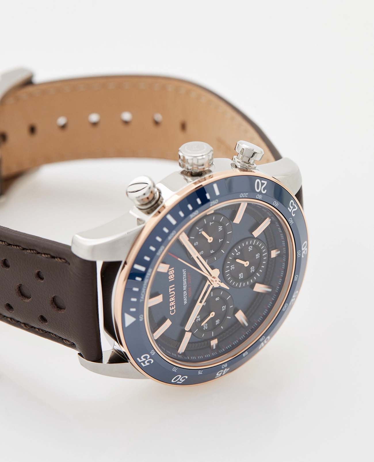 Французские мужские часы Cerruti 1881 Turchino CIWGF0007601, кварцевый механизм с высокой точностью. Минеральное стеклоМинеральное стеклоМинеральное стекло представляет собой искусственно выращенный минерал кварца. Такое стекло отличается особой устойчивостью к повреждениям и царапинам. Уступает по некоторым качествам сапфировому стеклу. устойчивое к мелким механическим повреждениям. Корпус часов изготовлен из стали. БезельБезельВнешний ободок, закрепляющий стекло. В спортивных часах так называется поворотное кольцо с делениями на циферблате, выполняет роль таймера – замеряет отрезки времени на шкале. Неподвижный безель – элемент декора. Однонаправленно вращающийся безель на дайверских часах позволяет фиксировать моменты погружения и выныривания на поверхность. из нержавеющей стали и кермики со шкалой тахиметрТахиметрРазмеченная шкала, располагается на ободке или безеле часов. Тахиметр позволяет рассчитать скорость на определённом участке пути, расстояние измеряется в километрах или милях.. Циферблат выполнен с метками в виде штрихов. Стрелки и метки с люминесцентным покрытиемЛюминесцентное покрытиеПозволяет считывать показания времени в темноте. Производители наносят на стрелки, часовые индексы, безель или поверхность циферблата светонакопительный состав, дающий холодное свечение.. Класс водозащиты: 100 метров, позволит плавать, нырять и заниматься другими водными видами спорта. Кожаный ремешок на стандартной застежке.