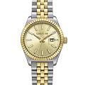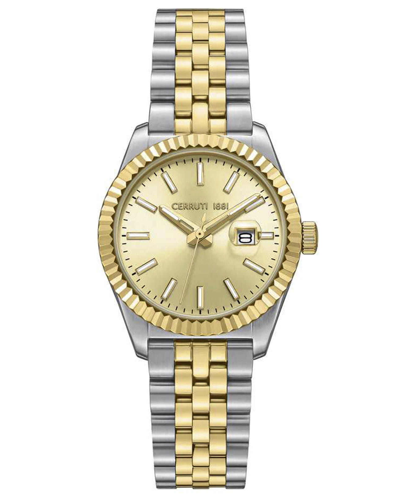 Женские кварцевые часы Cerruti 1881 Chienti CIWLH0084201 — изысканный французский аксессуар с золотистыми акцентами и функцией даты. Корпус из нержавеющей стали 316L. БезельБезельВнешний ободок, закрепляющий стекло. В спортивных часах так называется поворотное кольцо с делениями на циферблате, выполняет роль таймера – замеряет отрезки времени на шкале. Неподвижный безель – элемент декора. Однонаправленно вращающийся безель на дайверских часах позволяет фиксировать моменты погружения и выныривания на поверхность. с частичным PVD-покрытиемPVDУльтратонкое покрытие наносится в технике вакуумного напыления, сочетает в себе нитрид титана особой прочности со слоем золота или оксида хрома. Несёт в себе декоративную или защитную функцию. золотистого цвета, размером 31 мм. Циферблат — золотой с штриховыми метками. Окошко даты в положении 3 часов. Стекло — минеральноеМинеральное стеклоМинеральное стекло представляет собой искусственно выращенный минерал кварца. Такое стекло отличается особой устойчивостью к повреждениям и царапинам. Уступает по некоторым качествам сапфировому стеклу. с сапфировым покрытием. Стрелки и метки с люминесцентным покрытиемЛюминесцентное покрытиеПозволяет считывать показания времени в темноте. Производители наносят на стрелки, часовые индексы, безель или поверхность циферблата светонакопительный состав, дающий холодное свечение.. Браслет — стальной с частичным PVD-покрытиемPVDУльтратонкое покрытие наносится в технике вакуумного напыления, сочетает в себе нитрид титана особой прочности со слоем золота или оксида хрома. Несёт в себе декоративную или защитную функцию. на застёжке «бабочка» с кнопкамиЗастёжка "бабочка"Такой вид застёжки дополняется предохранителями, помогающими избежать случайного раскрытия браслета. Обладают изящным исполнением. . Водонепроницаемость 50 м. Идеальный выбор для тех, кто ценит французский дизайн и повседневную элегантность.