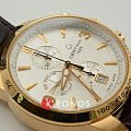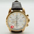 Брендовый аксессуар показывает время с абсолютной точностью благодаря швейцарскому автоматическому механизму ETA C01.211 с запасом хода на 40 часов. Ремешок выполнен из натуральной кожи, для изготовления корпуса выбрали сталь 316L с PVD-покрытиемPVDУльтратонкое покрытие наносится в технике вакуумного напыления, сочетает в себе нитрид титана особой прочности со слоем золота или оксида хрома. Несёт в себе декоративную или защитную функцию.. Стрелки и метки дополнены люминесцентной подсветкойЛюминесцентное покрытиеПозволяет считывать показания времени в темноте. Производители наносят на стрелки, часовые индексы, безель или поверхность циферблата светонакопительный состав, дающий холодное свечение.. Функции: секундомер, календарь, тахиметрТахиметрРазмеченная шкала, располагается на ободке или безеле часов. Тахиметр позволяет рассчитать скорость на определённом участке пути, расстояние измеряется в километрах или милях..