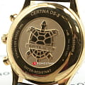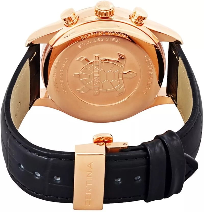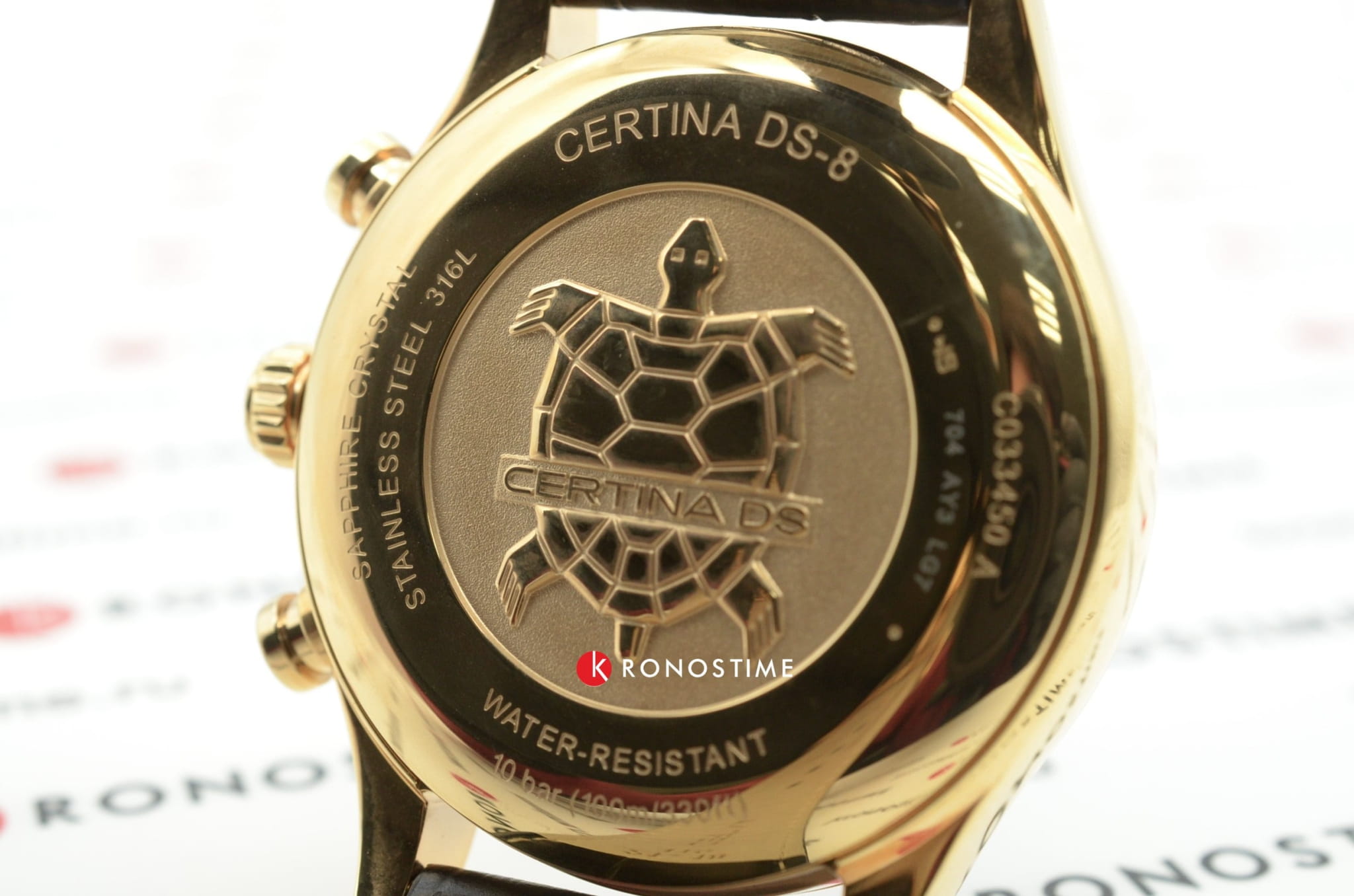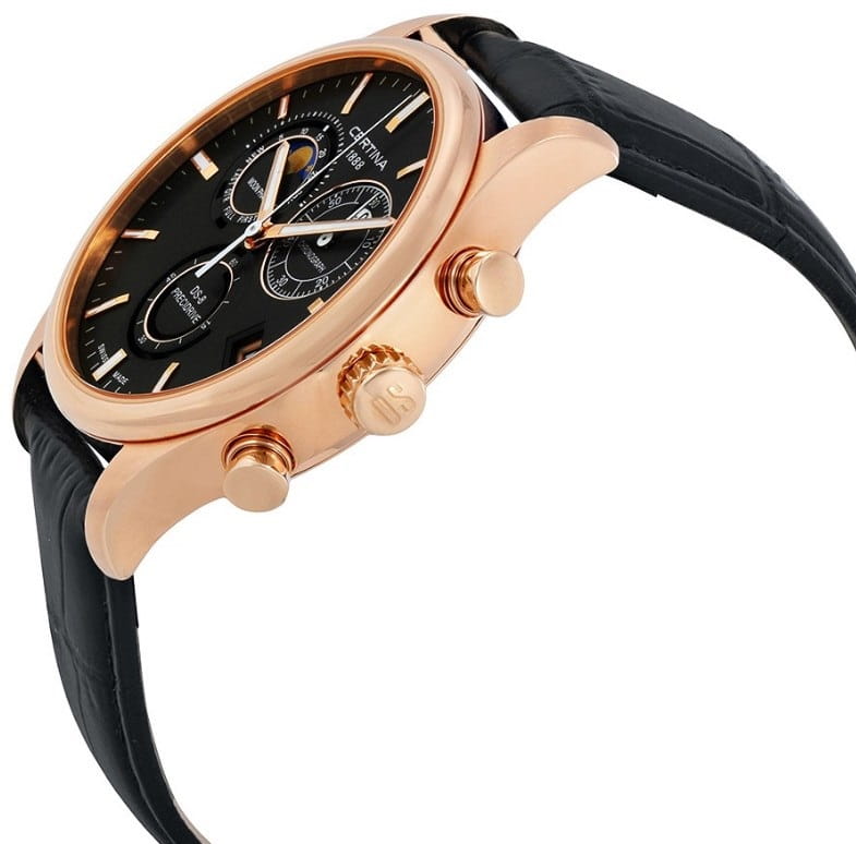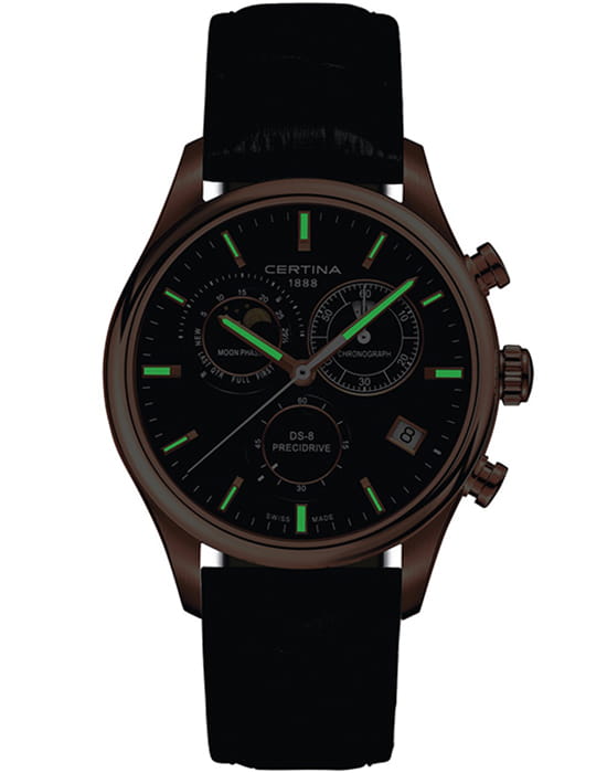 Модель, благодаря классической цветовой гамме и отсутствию броских деталей, станет универсальным аксессуаром к вашему образу. Брендовый хронографХронографФункция позволяет измерять отрезки времени с особой точностью: часы, минуты, секунды. Верным признаком хронографа является наличие на циферблате 3 дополнительных окошек-счётчиков. измеряет время с высокой точностью, что обеспечивает швейцарский кварцевый калибр ETA G10.962 Precidrive™Precidrive™Инновационный кварцевый механизм Certina. Часы, оснащённые этим швейцарским калибром, приравниваются к точности к сертифицированным хронометрам, точность хода составляет +/-10 секунд в год.. Ремешок из натуральной кожи. Сапфировое стекло с двухсторонним антибликовым покрытием. Корпус из нержавеющей стали 316L с PVD-покрытием.PVDУльтратонкое покрытие наносится в технике вакуумного напыления, сочетает в себе нитрид титана особой прочности со слоем золота или оксида хрома. Несёт в себе декоративную или защитную функцию.. Водостойкость 10 бар. Люминесцентная подсветкаЛюминесцентное покрытиеПозволяет считывать показания времени в темноте. Производители наносят на стрелки, часовые индексы, безель или поверхность циферблата светонакопительный состав, дающий холодное свечение.. Задняя крышка с гравировкой. Секундомер, дата, индикатор EOLEOLПредставляет собой систему, уведомляющую владельца часов о необходимости замены элемента питания. За 2 недели до полного разряда батарейки секундная стрелка перестаёт ходить чётко и начинает перепрыгивать на 3-4 деления., отображение лунных фаз. Диаметр корпуса: 41 мм.