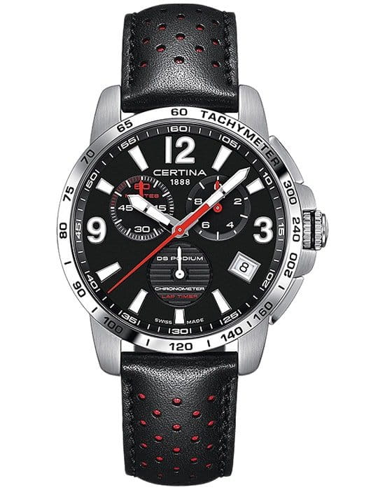 Наручные часы в спортивном стиле привлекают внимание красными деталями, что символизирует скоростное напряжение на гоночной трассе. Отличным дополнением стал кожаный ремешок с перфорацией из натурального материала. Кварцевый швейцарский механизм ETA G10.212 Precidrive™Precidrive™Инновационный кварцевый механизм Certina. Часы, оснащённые этим швейцарским калибром, приравниваются к точности к сертифицированным хронометрам, точность хода составляет +/-10 секунд в год. с повышенной точностью хода, подтверждённой сертификатом COSCСертификат COSCОфициальный сертификат, подтверждающий то, что часы ходят с особо высокой точностью. Для получения документа часы подвергаются тестовым испытаниям, разработанным швейцарским институтом тестирования хронометров COSC. Допустимая норма для механических часов -4/+6 секунд в день, для кварцевых моделей +/- 0,07 секунд в день.. Система DS ConceptDS ConceptDouble Security Concept, обозначает двойную надёжность и безупречную точность часов Certina. Двойная система защиты подразумевает обеспечение максимальной устойчивости к ударам и высоких показателей водонепроницаемости.. Двухстороннее антибликовое покрытие для стекла из сапфира. Стрелки и индексы с составом SuperLumiNovaЛюминесцентное покрытиеПозволяет считывать показания времени в темноте. Производители наносят на стрелки, часовые индексы, безель или поверхность циферблата светонакопительный состав, дающий холодное свечение.. Заводная головка с защитой. ХронографХронографФункция позволяет измерять отрезки времени с особой точностью: часы, минуты, секунды. Верным признаком хронографа является наличие на циферблате 3 дополнительных окошек-счётчиков., шкала тахиметраТахиметрРазмеченная шкала, располагается на ободке или безеле часов. Тахиметр позволяет рассчитать скорость на определённом участке пути, расстояние измеряется в километрах или милях., календарь, секундомер, индикатор EOLEOLПредставляет собой систему, уведомляющую владельца часов о необходимости замены элемента питания. За 2 недели до полного разряда батарейки секундная стрелка перестаёт ходить чётко и начинает перепрыгивать на 3-4 деления., Lap-функция измерения промежуточного времени (круга). Диаметр корпуса: 42 мм.