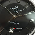 Модель выполнена в классическом стиле, благодаря чему она сохраняет актуальность во все времена. Цифру 6 заменяет прямоугольное окошко индикации текущего числа. Часы заводятся от движений руки носителя, швейцарский механизм ETA Powermatic 80Powermatic 80Эксклюзивный калибр от швейцарской компании ETA с увеличенным запасом хода до 80 часов за счёт удлинённой заводной пружины. Характеризуется улучшенной системой спуска со сниженным трением. сохраняет запас хода до 80-часов. Прозрачная задняя крышка. Сапфировое стекло. Стальной корпус с реализацией концепции DS ConceptDS ConceptDouble Security Concept, обозначает двойную надёжность и безупречную точность часов Certina. Двойная система защиты подразумевает обеспечение максимальной устойчивости к ударам и высоких показателей водонепроницаемости.. Ремешок из натуральной кожи. Водонепроницаемость 10 бар. Диаметр корпуса: 39 мм.