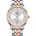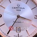Минималистичный циферблат выдержан в строгом и сдержанном стиле. Привлекательно смотрится стальной браслет с рядами звеньев различного размера. Часы с автоматической системой завода оснащены пружинным калибром ETA Powermatic 80Powermatic 80Эксклюзивный калибр от швейцарской компании ETA с увеличенным запасом хода до 80 часов за счёт удлинённой заводной пружины. Характеризуется улучшенной системой спуска со сниженным трением., имеющим с 80-часовой запас хода. Прозрачная задняя крышка. Надёжный корпус из антикоррозионной стали 316L. Розово-золотистое PVD-покрытиеPVDУльтратонкое покрытие наносится в технике вакуумного напыления, сочетает в себе нитрид титана особой прочности со слоем золота или оксида хрома. Несёт в себе декоративную или защитную функцию.. Концепция DS ConceptDS ConceptDouble Security Concept, обозначает двойную надёжность и безупречную точность часов Certina. Двойная система защиты подразумевает обеспечение максимальной устойчивости к ударам и высоких показателей водонепроницаемости.. Сапфировое стекло. Водонепроницаемость 10 бар. . Апертура даты. Диаметр корпуса: 39 мм.