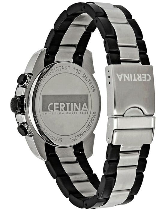 ХронографХронографФункция позволяет измерять отрезки времени с особой точностью: часы, минуты, секунды. Верным признаком хронографа является наличие на циферблате 3 дополнительных окошек-счётчиков. основан на концепции Двойной надёжности DSDS ConceptDouble Security Concept, обозначает двойную надёжность и безупречную точность часов Certina. Двойная система защиты подразумевает обеспечение максимальной устойчивости к ударам и высоких показателей водонепроницаемости.. Ударопрочный корпусУдаропрочный корпусМеханизм заключён в корпус, выполненный из современных материалов, устойчивых к ударам, механическим повреждениям и падению с высоты: инновационный пластик, карбон, нержавеющая сталь, титан. с PVD-покрытиемPVDУльтратонкое покрытие наносится в технике вакуумного напыления, сочетает в себе нитрид титана особой прочности со слоем золота или оксида хрома. Несёт в себе декоративную или защитную функцию. защищает швейцарский кварцевый механизм ETA G10.211. Люминесцентная подсветкаЛюминесцентное покрытиеПозволяет считывать показания времени в темноте. Производители наносят на стрелки, часовые индексы, безель или поверхность циферблата светонакопительный состав, дающий холодное свечение. стрелок позволяет пользоваться часами в темноте. Сапфировое стекло невозможно поцарапать.
