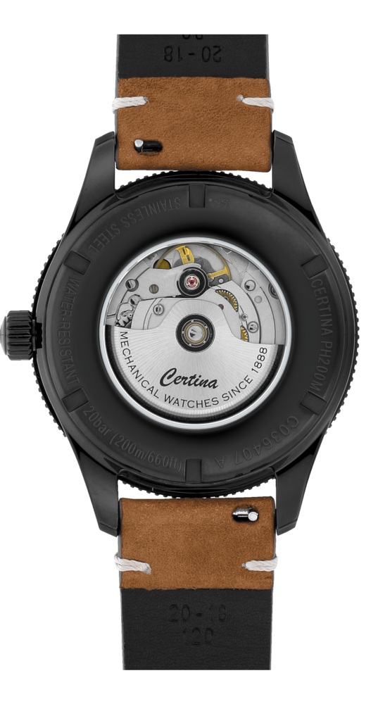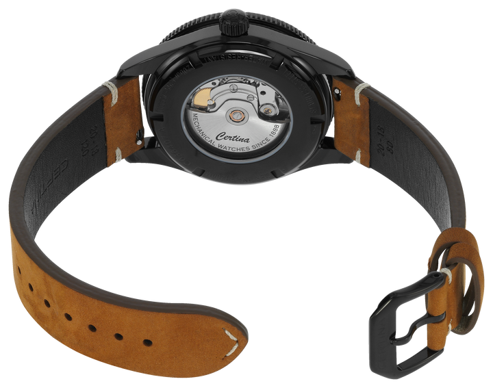 Оригинальный циферблат понравится ценителям ретро-дизайна. В комплекте с кожаным ремешком вы получаете дополнительный вариант из текстиля. Меняя их, вы можете экспериментировать с разными стилями. Уникальностью обладает не только аксессуар, но и упаковка, сделанная в виде бокса для дайвинга. Часы комплектуются автоматическим механизмом ETA Powermatic 80Powermatic 80Эксклюзивный калибр от швейцарской компании ETA с увеличенным запасом хода до 80 часов за счёт удлинённой заводной пружины. Характеризуется улучшенной системой спуска со сниженным трением. с 80-часовым запасом хода. Технология DS ConceptDS ConceptDouble Security Concept, обозначает двойную надёжность и безупречную точность часов Certina. Двойная система защиты подразумевает обеспечение максимальной устойчивости к ударам и высоких показателей водонепроницаемости.. Стекло с покрытием Nex scratchguard, устойчивым к царапинам. Вращающийся безельБезельВнешний ободок, закрепляющий стекло. В спортивных часах так называется поворотное кольцо с делениями на циферблате, выполняет роль таймера – замеряет отрезки времени на шкале. Неподвижный безель – элемент декора. Однонаправленно вращающийся безель на дайверских часах позволяет фиксировать моменты погружения и выныривания на поверхность.. Диаметр корпуса: 42,8 мм.