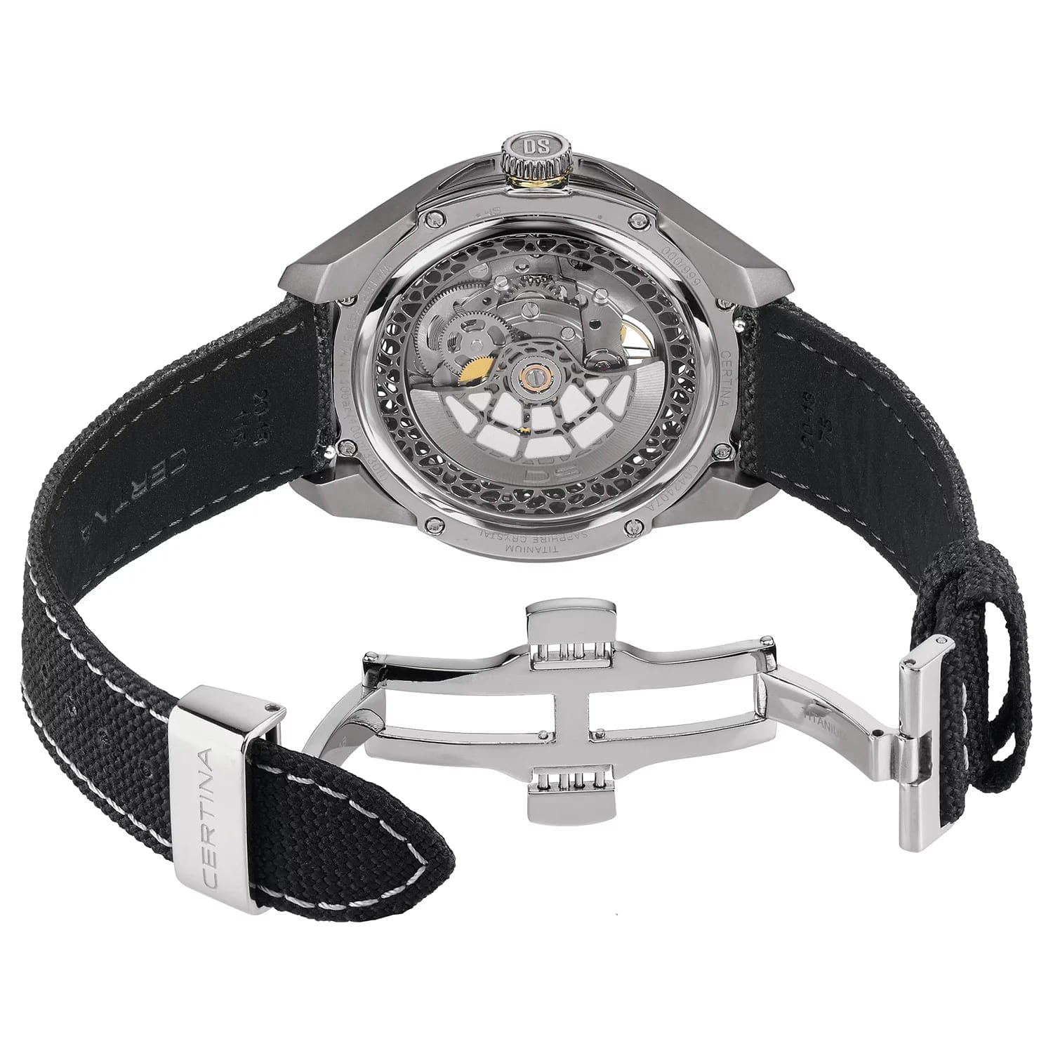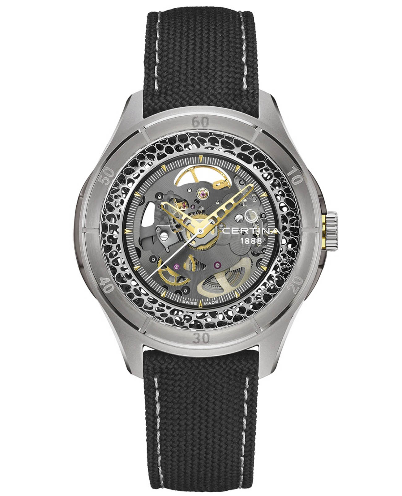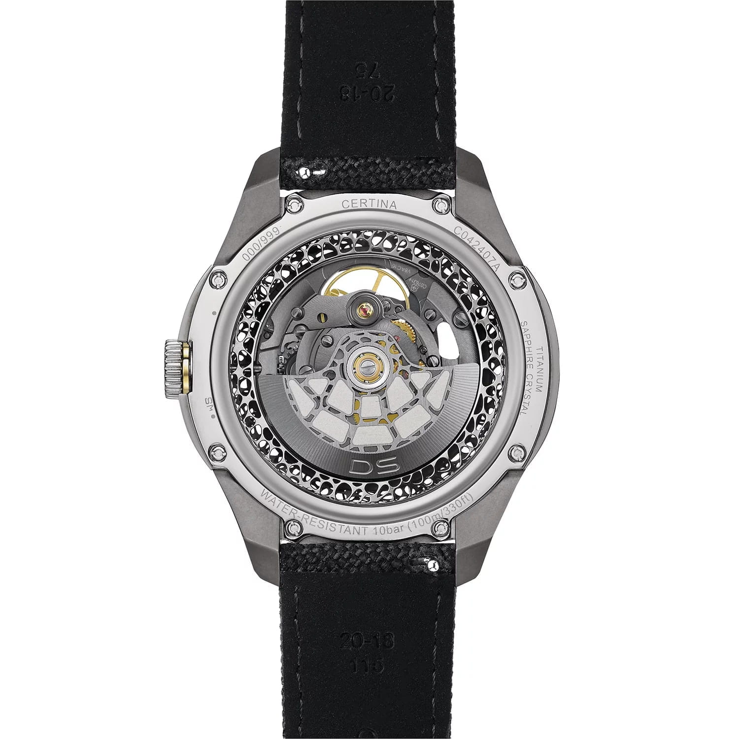 Мужские лимитированные швейцарские часы Certina DS Vision C042.407.56.081.10, механический механизм (автоматический калибр) с высокой точностью. Сапфировое стеклоСапфировое стеклоПрочный и надёжный материал из кристалла сапфира синтетического происхождения, характеризующийся особой твёрдостью и устойчивостью к царапинам и повреждениям. устойчивое к появлению царапин, обладающее высокой прозрачностью. Класс водозащиты: 100 метров, позволит плавать, нырять и заниматься другими водными видами спорта. Часы можно погрузить в воду, например, во время плавания. Благодаря завинчивающейся крышке часы сохраняют более высокую герметичность. Корпус часов изготовлен из титана. Производитель выбрал остекление крышки, которое позволяет любоваться уникальным сердцем часов. Антибликовое покрытиеАнтибликовое покрытиеСлой оксида металла в 0,13-0,3 микрон, благодаря которому стекло часов не бликует и не отражает свет. Антибликовое покрытие уменьшает отражение света в 10 раз, обеспечивая отличную читаемость показателей циферблата., нанесенное на стекло, устраняет любые блики на циферблате часов, что значительно облегчает чтение в солнечные дни. Тканевый ремешок на застёжке «бабочка» с кнопкамиЗастёжка "бабочка"Такой вид застёжки дополняется предохранителями, помогающими избежать случайного раскрытия браслета. Обладают изящным исполнением. . Это практичная и надежная застежка, которая позволяет быстро надевать и снимать часы. Запатентованная система DS ConceptDS ConceptDouble Security Concept, обозначает двойную надёжность и безупречную точность часов Certina. Двойная система защиты подразумевает обеспечение максимальной устойчивости к ударам и высоких показателей водонепроницаемости., созданная брендом Certina, повышает водонепроницаемость часов за счет дополнительных уплотнений на корпусе и заводной головке часов. Часы показывают время традиционным способом, используя механизм наведения.