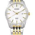 Часы Citizen BI5006-81P сочетают в себе японское качество, современный дизайн и надежность кварцевого механизма Citizen G111. Круглый корпус диаметром 39 мм выполнен из прочной нержавеющей стали, что обеспечивает долговечность и стильный внешний вид. Белый циферблат украшен метками в виде штрихов, а также дополнен окошком календаря с отображением даты и дня недели в позиции «3 часа». Стрелки с люминесцентным покрытиемЛюминесцентное покрытиеПозволяет считывать показания времени в темноте. Производители наносят на стрелки, часовые индексы, безель или поверхность циферблата светонакопительный состав, дающий холодное свечение., что обеспечивает отличную видимость в темноте. Минеральное стеклоМинеральное стеклоМинеральное стекло представляет собой искусственно выращенный минерал кварца. Такое стекло отличается особой устойчивостью к повреждениям и царапинам. Уступает по некоторым качествам сапфировому стеклу. защищает циферблат от царапин и повреждений. Рифленая заводная головка подчеркивает элегантность и практичность модели. Стальной браслет с частичным золотистым IP-покрытиемIP-покрытиеМетод ионного напыления. Демонстрирует повышенную устойчивость к истиранию, окислению и химическим веществам. Под воздействием высокого давления и температуры около 1500°C молекулы металла надёжно соединяются с частицами корпуса часов. оснащен надежной раскладной застёжкойРаскладная застёжкаТакой тип застёжки используется только на браслетах из металла. Она никогда не раскрывается полностью, происходит разделение на 2 и более частей. Раскладывающая застёжка снизит вероятность потери часов к минимуму., что обеспечивает комфортное ношение и подходит для любого случая. Водозащита до 50 метров позволяет не бояться случайных брызг и дождя.