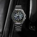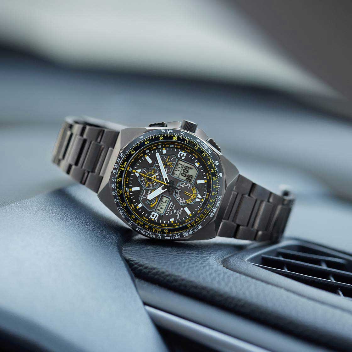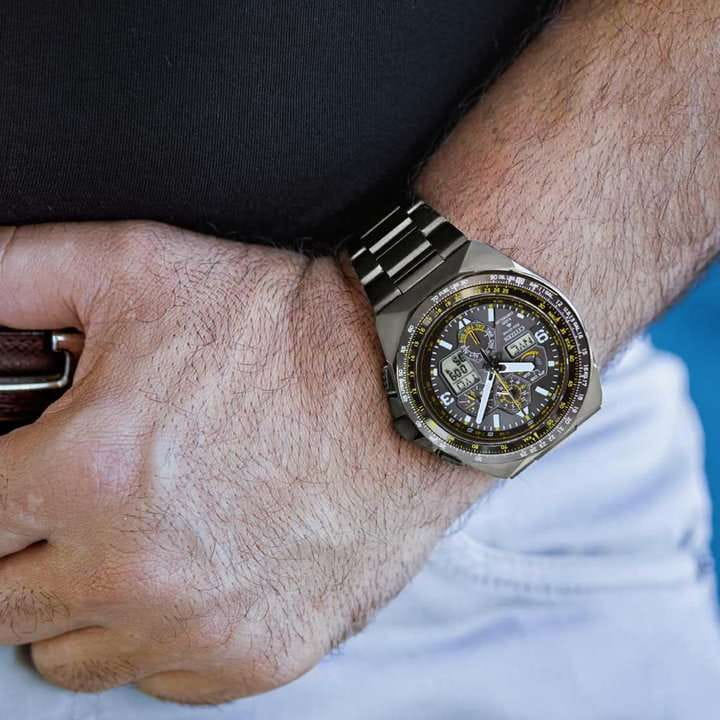 Citizen Promaster JY8127-59E часы-хронографХронографФункция позволяет измерять отрезки времени с особой точностью: часы, минуты, секунды. Верным признаком хронографа является наличие на циферблате 3 дополнительных окошек-счётчиков. с секундомеромСекундомерСекундоме́р — прибор, способный измерять интервалы времени с точностью до долей секунды. спортивного дизайна с высоким уровнем водозащиты. Корпус из нержавеющей стали с IP-покрытиемIP-покрытиеМетод ионного напыления. Демонстрирует повышенную устойчивость к истиранию, окислению и химическим веществам. Под воздействием высокого давления и температуры около 1500°C молекулы металла надёжно соединяются с частицами корпуса часов. диаметром 45,7 мм идеально сбалансирован. Сапфировое стеклоСапфировое стеклоПрочный и надёжный материал из кристалла сапфира синтетического происхождения, характеризующийся особой твёрдостью и устойчивостью к царапинам и повреждениям. с антибликовым покрытием обеспечивает отличную защиту циферблата от царапин. Часы работают на основе кварцевого механизма, питание от солнечной энергии. Стальной браслет на раскладной застёжкеРаскладная застёжкаТакой тип застёжки используется только на браслетах из металла. Она никогда не раскрывается полностью, происходит разделение на 2 и более частей. Раскладывающая застёжка снизит вероятность потери часов к минимуму. идеально дополняют дизайн часов, обеспечивая комфортное ношение. Стрелки и метки на циферблате имеют люминесцентное покрытиеЛюминесцентное покрытиеПозволяет считывать показания времени в темноте. Производители наносят на стрелки, часовые индексы, безель или поверхность циферблата светонакопительный состав, дающий холодное свечение. позволяющее легко определять время даже в темноте. Поворотный безельБезельВнешний ободок, закрепляющий стекло. В спортивных часах так называется поворотное кольцо с делениями на циферблате, выполняет роль таймера – замеряет отрезки времени на шкале. Неподвижный безель – элемент декора. Однонаправленно вращающийся безель на дайверских часах позволяет фиксировать моменты погружения и выныривания на поверхность.. Автоматический прием сигналов от радиовышек, расположенных в различных точках земного шара, которые передают временные сигналы от определенных атомных часов. Коррекция текущего времени радиосигналом на территории почти всей Европы, США, Японии и Китая. Функция индикации заряда (EOL) и предотвращения перезарядки. Мировое времяМировое время Полезное часовое усложнение, отображающее время в основных городах и известных областях по всему миру, оно связано с часовыми поясами, удобно для путешественников и бизнесменов. - 43 города, переход на зимнее и летнее время. Всемирное координированное время UTCUTCВсемирное кординационное время, не имеющее привязки к географическому положению Гринвича, основывается на атомном отсчёте времени. Регулировка времени осуществляется более точно, чем устаревшее GMT.