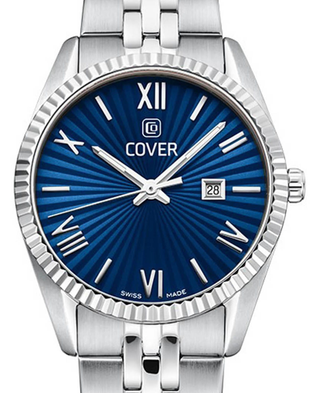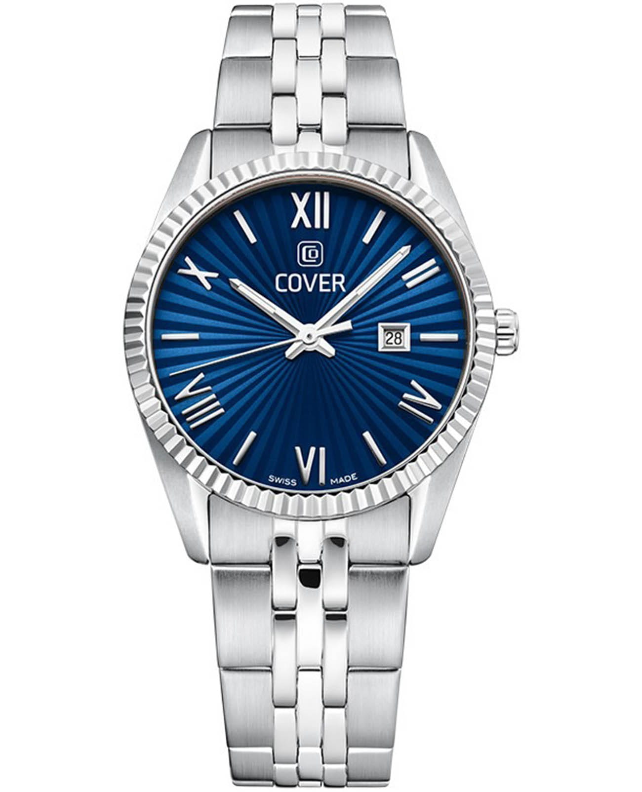 Часы COVER CO217.03 из коллекции Alston – элегантная модель швейцарского производства. Эти часы станут идеальным аксессуаром для элегантных дам, которые ценят стиль и качество. Корпус и браслет с раскладной застёжкойРаскладная застёжкаТакой тип застёжки используется только на браслетах из металла. Она никогда не раскрывается полностью, происходит разделение на 2 и более частей. Раскладывающая застёжка снизит вероятность потери часов к минимуму. изготовлены из нержавеющей стали, имеют диаметр 30 мм. На синем циферблате расположены  накладные римские цифры. Надежное минеральное стеклоМинеральное стеклоМинеральное стекло представляет собой искусственно выращенный минерал кварца. Такое стекло отличается особой устойчивостью к повреждениям и царапинам. Уступает по некоторым качествам сапфировому стеклу. защищает часы от царапин и долго сохраняет первоначальный внешний вид. Они показывают день месяца, индикатор которых с накладной рамкой расположен в положении «3 часа». Водозащита 50 метров делает часы практичными для повседневного использования. На часовую, минутную стрелки нанесено люминесцентное покрытиеЛюминесцентное покрытиеПозволяет считывать показания времени в темноте. Производители наносят на стрелки, часовые индексы, безель или поверхность циферблата светонакопительный состав, дающий холодное свечение., которое светится в темноте, создавая необычное изображение. Эти часы идеально подойдут для светских раутов, бизнес-встреч и других важных событий, подчеркнут вашу элегантность и статус.