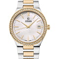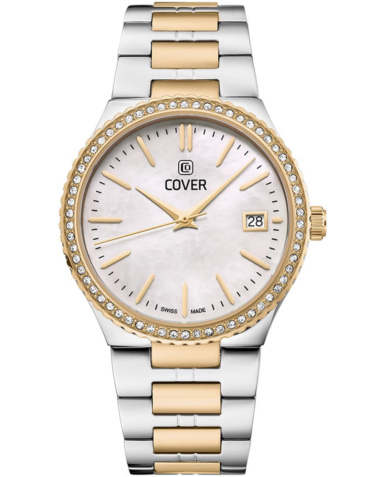 Cover Jumeira CO218.03 – элегантные женские часы, сочетающие современный дизайн и швейцарское качество. Корпус диаметром 36 мм выполнен из нержавеющей стали 316L, что придаёт модели роскошный вид и обеспечивает долговечность. БезельБезельВнешний ободок, закрепляющий стекло. В спортивных часах так называется поворотное кольцо с делениями на циферблате, выполняет роль таймера – замеряет отрезки времени на шкале. Неподвижный безель – элемент декора. Однонаправленно вращающийся безель на дайверских часах позволяет фиксировать моменты погружения и выныривания на поверхность. с PVD-покрытиемPVDУльтратонкое покрытие наносится в технике вакуумного напыления, сочетает в себе нитрид титана особой прочности со слоем золота или оксида хрома. Несёт в себе декоративную или защитную функцию. украшен кристаллами, добавляя изысканности и блеска, а поверхность циферблата защищена сапфировым стекломСапфировое стеклоПрочный и надёжный материал из кристалла сапфира синтетического происхождения, характеризующийся особой твёрдостью и устойчивостью к царапинам и повреждениям., устойчивым к царапинам. Часы оснащены швейцарским кварцевым механизмом, обеспечивающим точный ход и надёжность. Функциональность дополняется окошком даты, расположенным на позиции «3 часа». Браслет из нержавеющей стали с PVD-покрытиемPVDУльтратонкое покрытие наносится в технике вакуумного напыления, сочетает в себе нитрид титана особой прочности со слоем золота или оксида хрома. Несёт в себе декоративную или защитную функцию. оснащён раскладной застёжкойРаскладная застёжкаТакой тип застёжки используется только на браслетах из металла. Она никогда не раскрывается полностью, происходит разделение на 2 и более частей. Раскладывающая застёжка снизит вероятность потери часов к минимуму., обеспечивающей удобную и надёжную фиксацию на запястье. Водонепроницаемость 50 метров (5 ATM) позволяет использовать часы в повседневной жизни, защищая их от случайных брызг и дождя.
