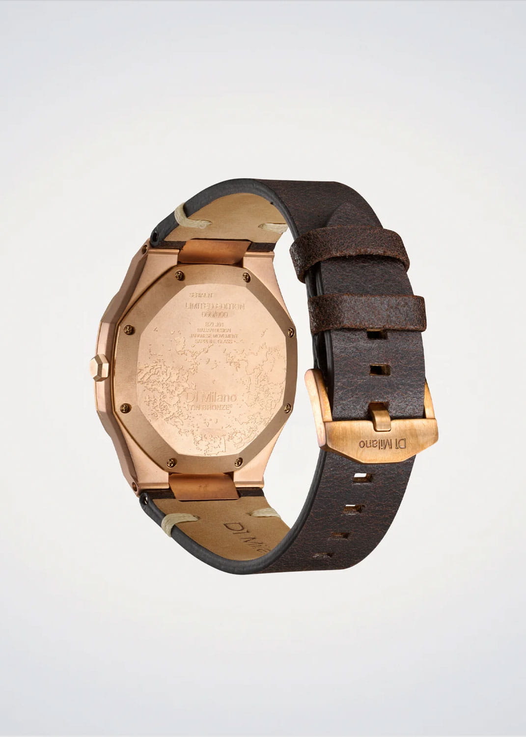 Часы D1 Milano Automatico BZLJ01 — это эффектные механические мужские часы, разработанные для ценителей уникальных аксессуаров. Их утонченный дизайн и высокое качество исполнения делают эти часы незаменимым элементом вашего стиля. Изготовленные в Италии, они оснащены надежным механизмом Miyota 9039 с автоподзаводом, обеспечивающими запас хода до 42 часа. Частота работы механизма составляет 28800 полуколебаний в час. Часы имеют корпус из бронзы, диаметром 40 мм, что гарантирует долговечность и стойкость к внешним воздействиям.Циферблат защищен сапфировым стекломСапфировое стеклоПрочный и надёжный материал из кристалла сапфира синтетического происхождения, характеризующийся особой твёрдостью и устойчивостью к царапинам и повреждениям. с антибликовым покрытиемАнтибликовое покрытиеСлой оксида металла в 0,13-0,3 микрон, благодаря которому стекло часов не бликует и не отражает свет. Антибликовое покрытие уменьшает отражение света в 10 раз, обеспечивая отличную читаемость показателей циферблата., подчеркивающим элегантность и изысканность модели и защищает от царапин. Стрелки с люминесцентным покрытиемЛюминесцентное покрытиеПозволяет считывать показания времени в темноте. Производители наносят на стрелки, часовые индексы, безель или поверхность циферблата светонакопительный состав, дающий холодное свечение.. Метки в виде штрихов придают часам особый шарм. Кожаный ремешок на стандартной застёжке обеспечивает комфортное и надежное ношение. Водозащита до 50 WR делает эти часы подходящими для повседневного использования.