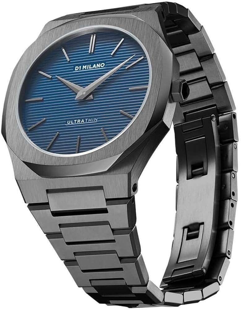 Часы D1 Milano UTBJ12 — это уникальные кварцевые часы, которые подчеркнут ваш изысканный стиль. Эти наручные часы из коллекции Ultra Thin с эффектным монохромным дизайном станут выразительным акцентом вашего образа. Корпус диаметром 40 мм из нержавеющей стали с PVDPVDУльтратонкое покрытие наносится в технике вакуумного напыления, сочетает в себе нитрид титана особой прочности со слоем золота или оксида хрома. Несёт в себе декоративную или защитную функцию. придает часам современный и утонченный вид. Синий циферблат метками в виде штрихов, а серебристые хроматические стрелки и индексы создают стильный контраст, подчёркивая элегантность модели. Задняя крышка из нержавеющей стали закреплена на 8-х винтах и дополнена индивидуальным серийным номером, что подчеркивает уникальность каждого экземпляра. Стальной браслет с PVDPVDУльтратонкое покрытие наносится в технике вакуумного напыления, сочетает в себе нитрид титана особой прочности со слоем золота или оксида хрома. Несёт в себе декоративную или защитную функцию. и с раскладной застёжкойРаскладная застёжкаТакой тип застёжки используется только на браслетах из металла. Она никогда не раскрывается полностью, происходит разделение на 2 и более частей. Раскладывающая застёжка снизит вероятность потери часов к минимуму. обеспечивает надежность и комфорт в повседневном использовании. Сапфировое стеклоСапфировое стеклоПрочный и надёжный материал из кристалла сапфира синтетического происхождения, характеризующийся особой твёрдостью и устойчивостью к царапинам и повреждениям. с антибликовым покрытием защищает циферблат, а водозащита до 50WR делает эти часы практичным выбором для любых условий. Благодаря калибру Miyota 1L22, они отличаются точностью и надежностью. Эти итальянские часы представляют собой идеальное сочетание традиционного мастерства и инновационного подхода, воплощая в себе новый взгляд на классическую элегантность.