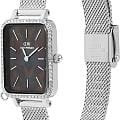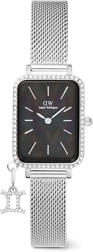Женские наручные часы с минеральным стекломМинеральное стеклоМинеральное стекло представляет собой искусственно выращенный минерал кварца. Такое стекло отличается особой устойчивостью к повреждениям и царапинам. Уступает по некоторым качествам сапфировому стеклу. Daniel Wellington Quadro Crystal Zodiac Sterling DW00100747, кварцевый механизм с высокой точностью. Корпус часов изготовлен из нержавеющей стали. БезельБезельВнешний ободок, закрепляющий стекло. В спортивных часах так называется поворотное кольцо с делениями на циферблате, выполняет роль таймера – замеряет отрезки времени на шкале. Неподвижный безель – элемент декора. Однонаправленно вращающийся безель на дайверских часах позволяет фиксировать моменты погружения и выныривания на поверхность. украшен кристаллами Swarovski. Матовый циферблат украшен фирменным логотипом Daniel Wellington. Накладные метки в виде штрихов. Японский кварцевый механизм. Рифленая заводная головка. Класс водозащиты: 30 метров, позволит защитить корпус от случайных брызг или капель дождя. Стальной браслет миланского плетения на раскладном замкеРаскладной замокДанный вариант застежки используется только на часах с металлическим браслетом. Отличительная особенность такого крепления в том, что длина браслета становится универсальной и вы можете самостоятельно отрегулировать нужный вам размер – застежка просто двигается по браслету часов.. Корпус дополнен колечком для подвески.