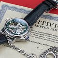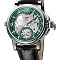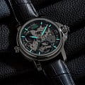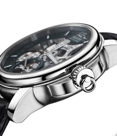 Мужские механические часы с ручным подзаводом Epos из коллекции Oeuvre d'art — это настоящее произведение часового искусства. Корпус диаметром 45 мм и толщиной 13 мм выполнен из нержавеющей стали 316L. Циферблат изумрудно-зелёного цвета частично скелетонизирован, с открытой центральной частью, что позволяет наблюдать за работой механизма. Циферблат защищён сапфировым стекломСапфировое стеклоПрочный и надёжный материал из кристалла сапфира синтетического происхождения, характеризующийся особой твёрдостью и устойчивостью к царапинам и повреждениям.. Малая секундная стрелка вынесена на отдельный циферблат. Механизм — швейцарский калибр ETA Unitas 6498 с ручным подзаводом, модифицированный и декорированный вручную: мосты скелетонизированы, украшены гравировкой и жемчужным зернением. Прозрачная задняя крышка позволяет наблюдать за работой механизма. Заводная головка — винтовая, формы «луковица». Часы оснащены кожаным ремешком чёрного цвета с тиснением под аллигатора и застёжкой «бабочка» с кнопкамиЗастёжка "бабочка"Такой вид застёжки дополняется предохранителями, помогающими избежать случайного раскрытия браслета. Обладают изящным исполнением. . Модель выпущена ограниченной серией — 2015 экземпляров. Водонепроницаемость 50 м позволяет использовать часы в повседневных условиях. Гарантия — 24 месяца. Уникальный выбор для ценителя ручного мастерства и эксклюзивного дизайна.