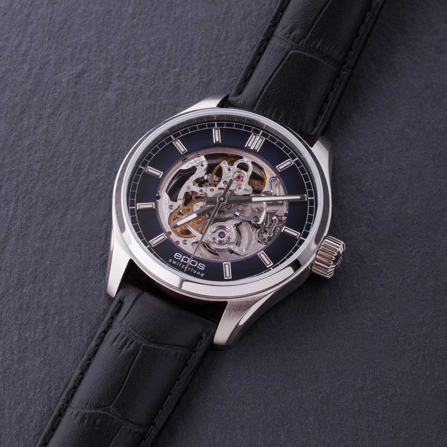 Мужские механические часы с автоподзаводом Epos из коллекции Passion — это сочетание швейцарского мастерства и современного дизайна. Корпус диаметром 41 мм и толщиной 11 мм выполнен из нержавеющей стали 316L. Циферблат синего цвета частично скелетонизирован, что позволяет наблюдать за работой механизма. Циферблат защищён сапфировым стекломСапфировое стеклоПрочный и надёжный материал из кристалла сапфира синтетического происхождения, характеризующийся особой твёрдостью и устойчивостью к царапинам и повреждениям.. Стрелки и метки с люминесцентным покрытиемЛюминесцентное покрытиеПозволяет считывать показания времени в темноте. Производители наносят на стрелки, часовые индексы, безель или поверхность циферблата светонакопительный состав, дающий холодное свечение., обеспечивающим хорошую читаемость в темноте. Механизм — швейцарский калибр Sellita SW200. Прозрачная задняя крышка открывает вид на декорированный механизм. Часы оснащены кожаным ремешком чёрного цвета с застёжкой «бабочка» с кнопкамиЗастёжка "бабочка"Такой вид застёжки дополняется предохранителями, помогающими избежать случайного раскрытия браслета. Обладают изящным исполнением. . Водонепроницаемость 100 м позволяет использовать часы для плавания и повседневного ношения. Гарантия — 24 месяца. Универсальный выбор для ценителя механики и выразительного стиля.