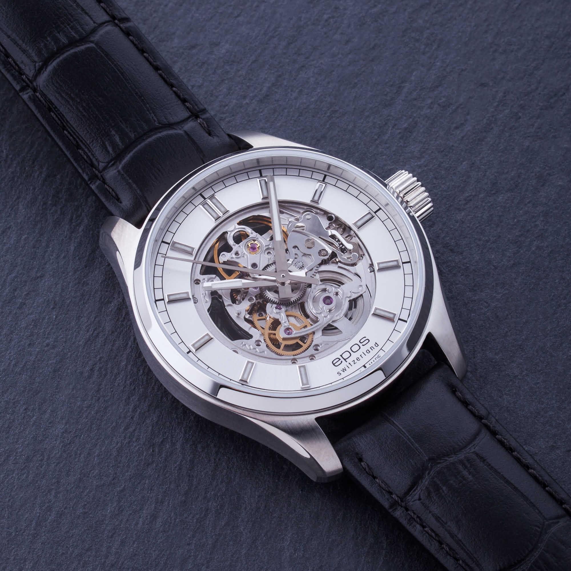 Мужские механические часы с автоподзаводом Epos из коллекции Passion — это сочетание швейцарского мастерства и современного дизайна. Корпус диаметром 41 мм и толщиной 11 мм выполнен из нержавеющей стали 316L. Циферблат серебристого цвета частично скелетонизирован, что позволяет наблюдать за работой механизма. Циферблат защищён сапфировым стекломСапфировое стеклоПрочный и надёжный материал из кристалла сапфира синтетического происхождения, характеризующийся особой твёрдостью и устойчивостью к царапинам и повреждениям.. Стрелки и метки с люминесцентным покрытиемЛюминесцентное покрытиеПозволяет считывать показания времени в темноте. Производители наносят на стрелки, часовые индексы, безель или поверхность циферблата светонакопительный состав, дающий холодное свечение., обеспечивающим хорошую читаемость в темноте. Механизм — швейцарский калибр Sellita SW200. Прозрачная задняя крышка открывает вид на декорированный механизм. Часы оснащены кожаным ремешком чёрного цвета со стандартной застёжкой. Водонепроницаемость 100 м позволяет использовать часы для плавания и повседневного ношения. Гарантия — 24 месяца. Универсальный выбор для ценителя механики и выразительного стиля.