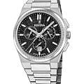 Мужские кварцевые часы Festina из коллекции Rivé — это элегантный аксессуар с швейцарским качеством и функциональным дизайном. Корпус диаметром 42,5 мм и толщиной 12 мм выполнен из нержавеющей стали серебряного цвета. Циферблат чёрного цвета дополнен малым циферблатом для секунд и окошком даты в положении 3 часов. Циферблат защищён сапфировым стекломСапфировое стеклоПрочный и надёжный материал из кристалла сапфира синтетического происхождения, характеризующийся особой твёрдостью и устойчивостью к царапинам и повреждениям.. Стрелки с люминесцентным покрытиемЛюминесцентное покрытиеПозволяет считывать показания времени в темноте. Производители наносят на стрелки, часовые индексы, безель или поверхность циферблата светонакопительный состав, дающий холодное свечение., обеспечивающим хорошую читаемость в темноте. Заводная головка — вытягивающегося типа, задняя крышка — завинчивающаяся. Часы оснащены стальным браслетом на застёжке «бабочка» с кнопкамиЗастёжка "бабочка"Такой вид застёжки дополняется предохранителями, помогающими избежать случайного раскрытия браслета. Обладают изящным исполнением. . Механизм — швейцарский кварцевый калибр Ronda 5030.D с функцией хронографаХронографФункция позволяет измерять отрезки времени с особой точностью: часы, минуты, секунды. Верным признаком хронографа является наличие на циферблате 3 дополнительных окошек-счётчиков.: центральная секундная стрелка, функции сплит и добавления времени. Срок службы батареи — 54 месяца. Водонепроницаемость 100 м позволяет использовать часы для плавания. Универсальный выбор для тех, кто ценит точность, стиль и швейцарское мастерство.