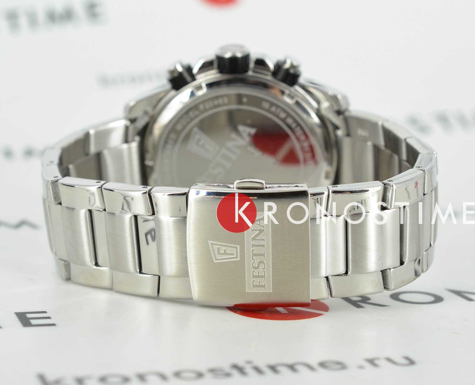 Festina F20463/4 — стильные и функциональные наручные мужские часы с хронографомХронографФункция позволяет измерять отрезки времени с особой точностью: часы, минуты, секунды. Верным признаком хронографа является наличие на циферблате 3 дополнительных окошек-счётчиков. и секундомеромСекундомерСекундоме́р — прибор, способный измерять интервалы времени с точностью до долей секунды., предназначенные для активных и современных мужчин. Оснащены высокоточным кварцевым механизмом, обеспечивающим надежную и стабильную работу. Особое внимание заслуживает минеральное стеклоМинеральное стеклоМинеральное стекло представляет собой искусственно выращенный минерал кварца. Такое стекло отличается особой устойчивостью к повреждениям и царапинам. Уступает по некоторым качествам сапфировому стеклу., устойчивое к появлению царапин и отличающееся высокой прозрачностью, что гарантирует идеальную читаемость циферблата на протяжении многих лет эксплуатации. Благодаря классу водозащиты 100 метров (10 ATM), данная модель прекрасно подходит для плавания, ныряния и занятий водными видами спорта, не опасаясь за сохранность механизма. Четкие стрелки и метки покрыты люминесцентным покрытиемЛюминесцентное покрытиеПозволяет считывать показания времени в темноте. Производители наносят на стрелки, часовые индексы, безель или поверхность циферблата светонакопительный состав, дающий холодное свечение., благодаря чему время можно определить даже в условиях плохого освещения или полной темноты. Корпус часов выполнен из прочной нержавеющей стали 316L, что обеспечивает не только долговечность, но и презентабельный внешний вид. На безельБезельВнешний ободок, закрепляющий стекло. В спортивных часах так называется поворотное кольцо с делениями на циферблате, выполняет роль таймера – замеряет отрезки времени на шкале. Неподвижный безель – элемент декора. Однонаправленно вращающийся безель на дайверских часах позволяет фиксировать моменты погружения и выныривания на поверхность. нанесена секундная шкала. Металлический браслет оснащен надежной раскладной застёжкойРаскладная застёжкаТакой тип застёжки используется только на браслетах из металла. Она никогда не раскрывается полностью, происходит разделение на 2 и более частей. Раскладывающая застёжка снизит вероятность потери часов к минимуму., которая гарантирует комфортную посадку на запястье и легкость снятия. Также часы дополнены удобным календарем с окошком даты на позиции 4 часа.