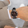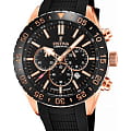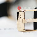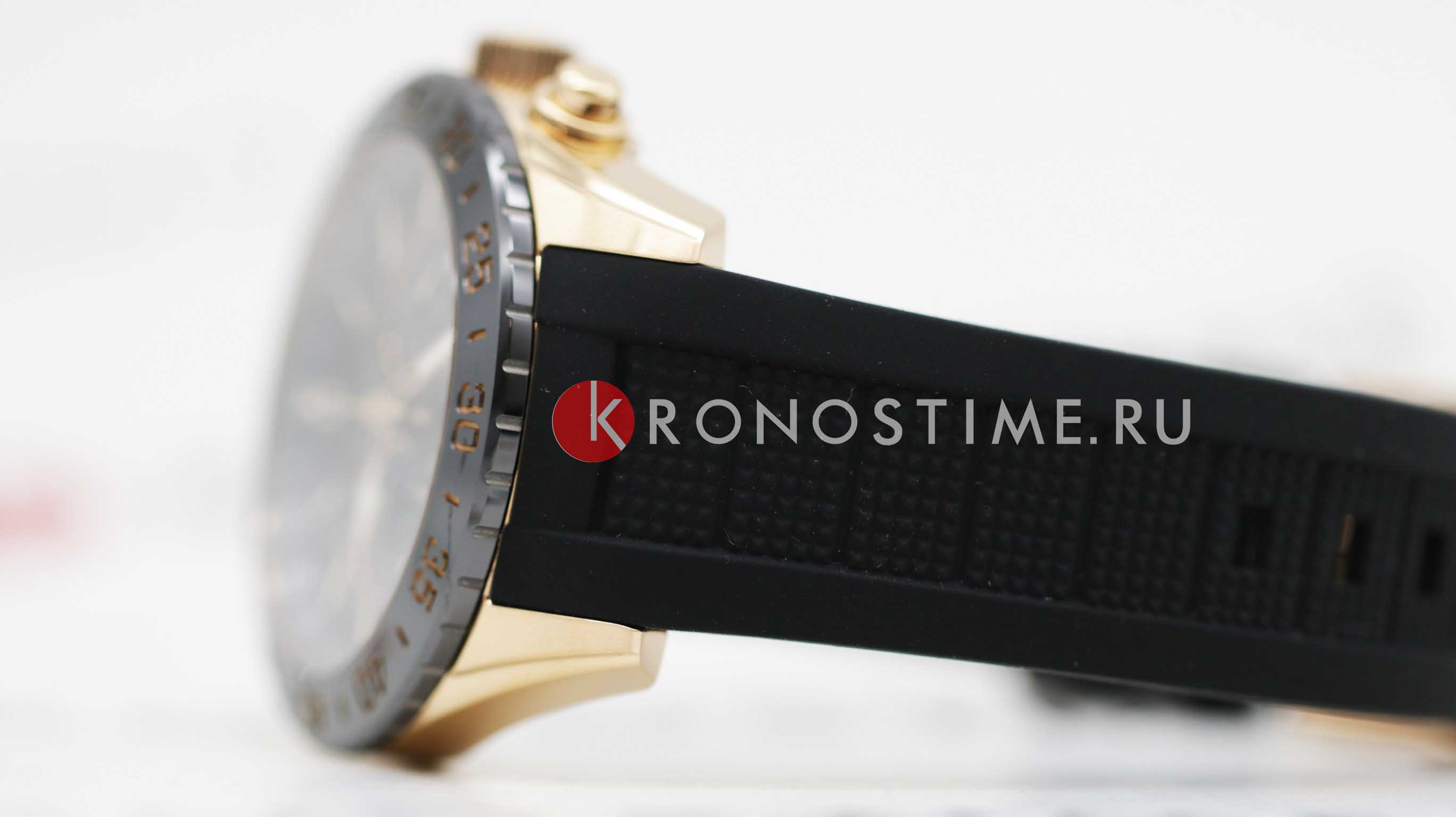 Часы-хронографХронографФункция позволяет измерять отрезки времени с особой точностью: часы, минуты, секунды. Верным признаком хронографа является наличие на циферблате 3 дополнительных окошек-счётчиков.. Кварцевый механизм с высокой точностью. Сапфировое стеклоСапфировое стеклоПрочный и надёжный материал из кристалла сапфира синтетического происхождения, характеризующийся особой твёрдостью и устойчивостью к царапинам и повреждениям. устойчивое к появлению царапин, обладающее высокой прозрачностью. Керамический безельБезельВнешний ободок, закрепляющий стекло. В спортивных часах так называется поворотное кольцо с делениями на циферблате, выполняет роль таймера – замеряет отрезки времени на шкале. Неподвижный безель – элемент декора. Однонаправленно вращающийся безель на дайверских часах позволяет фиксировать моменты погружения и выныривания на поверхность.. Класс водозащиты: 100 метров, позволит плавать, нырять и заниматься другими водными видами спорта. Стрелки и метки с люминесцентным покрытиемЛюминесцентное покрытиеПозволяет считывать показания времени в темноте. Производители наносят на стрелки, часовые индексы, безель или поверхность циферблата светонакопительный состав, дающий холодное свечение.. Корпус часов изготовлен из нержавеющей стали c PVD-покрытиемPVDУльтратонкое покрытие наносится в технике вакуумного напыления, сочетает в себе нитрид титана особой прочности со слоем золота или оксида хрома. Несёт в себе декоративную или защитную функцию. розового цвета. Каучуковый ремешок с классической застежкой.