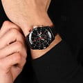 Часы-хронографХронографФункция позволяет измерять отрезки времени с особой точностью: часы, минуты, секунды. Верным признаком хронографа является наличие на циферблате 3 дополнительных окошек-счётчиков.. Кварцевый механизм с высокой точностью. Минеральное стеклоМинеральное стеклоМинеральное стекло представляет собой искусственно выращенный минерал кварца. Такое стекло отличается особой устойчивостью к повреждениям и царапинам. Уступает по некоторым качествам сапфировому стеклу. устойчивое к появлению царапин, обладающее высокой прозрачностью. Класс водозащиты: 100 метров, позволит плавать, нырять и заниматься другими водными видами спорта. Стрелки и метки с люминесцентным покрытиемЛюминесцентное покрытиеПозволяет считывать показания времени в темноте. Производители наносят на стрелки, часовые индексы, безель или поверхность циферблата светонакопительный состав, дающий холодное свечение.. Корпус часов изготовлен из нержавеющей стали c PVD-покрытиемPVDУльтратонкое покрытие наносится в технике вакуумного напыления, сочетает в себе нитрид титана особой прочности со слоем золота или оксида хрома. Несёт в себе декоративную или защитную функцию.. Кожаный ремешок с классической застежкой.