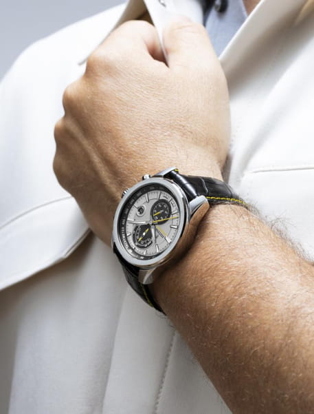 Кварцевый механизм с высокой точностью c хронографомХронографФункция позволяет измерять отрезки времени с особой точностью: часы, минуты, секунды. Верным признаком хронографа является наличие на циферблате 3 дополнительных окошек-счётчиков.. Минеральное стеклоМинеральное стеклоМинеральное стекло представляет собой искусственно выращенный минерал кварца. Такое стекло отличается особой устойчивостью к повреждениям и царапинам. Уступает по некоторым качествам сапфировому стеклу. устойчивое к появлению царапин, обладающее высокой прозрачностью. Класс водозащиты: 100 метров, позволит плавать, нырять и заниматься другими водными видами спорта. Корпус часов изготовлен из нержавеющей стали. Кожаный ремешок на стандартной застежке. БезельБезельВнешний ободок, закрепляющий стекло. В спортивных часах так называется поворотное кольцо с делениями на циферблате, выполняет роль таймера – замеряет отрезки времени на шкале. Неподвижный безель – элемент декора. Однонаправленно вращающийся безель на дайверских часах позволяет фиксировать моменты погружения и выныривания на поверхность. с PVD-покрытиемPVDУльтратонкое покрытие наносится в технике вакуумного напыления, сочетает в себе нитрид титана особой прочности со слоем золота или оксида хрома. Несёт в себе декоративную или защитную функцию.. Стрелки и метки с люминесцентным покрытиемЛюминесцентное покрытиеПозволяет считывать показания времени в темноте. Производители наносят на стрелки, часовые индексы, безель или поверхность циферблата светонакопительный состав, дающий холодное свечение..