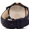 Рельефный черно-синий циферблат с накладными золотистыми часовыми метками и счетчиками хронографа.