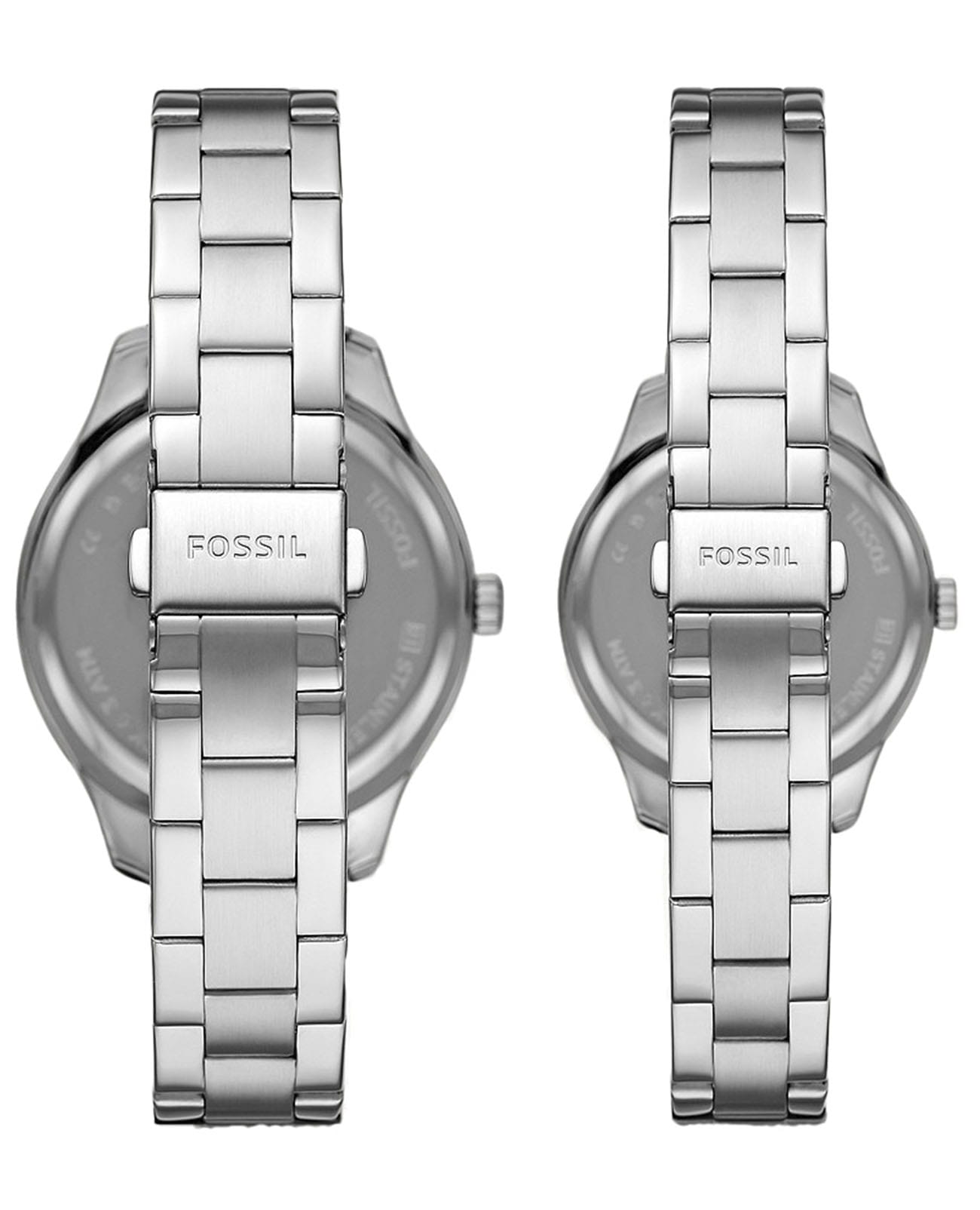 Парный комплект часов Fossil Rye His and Her Multifunction Stainless Steel Watch Set BQ2644SET, кварцевый механизм с высокой точностью. Минеральное стеклоМинеральное стеклоМинеральное стекло представляет собой искусственно выращенный минерал кварца. Такое стекло отличается особой устойчивостью к повреждениям и царапинам. Уступает по некоторым качествам сапфировому стеклу. устойчивое к мелким механическим повреждениям. Класс водозащиты: 30 метров, позволит защитить корпус от случайных брызг или капель дождя. Корпус часов изготовлен из стали. Метки в виде штрихов и римских цифр. Функции даты, дня недели и 24 часового формата времени вынесены на отдельные циферблаты. Ширина корпуса для мужских часов: 42мм, для женских часов: 36мм. Рифленая заводная головка. Стальной браслет на раскладной застёжкеРаскладная застёжкаТакой тип застёжки используется только на браслетах из металла. Она никогда не раскрывается полностью, происходит разделение на 2 и более частей. Раскладывающая застёжка снизит вероятность потери часов к минимуму.. Ширина браслета для мужских часов: 18мм, для женских часов: 16мм.