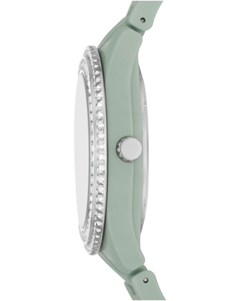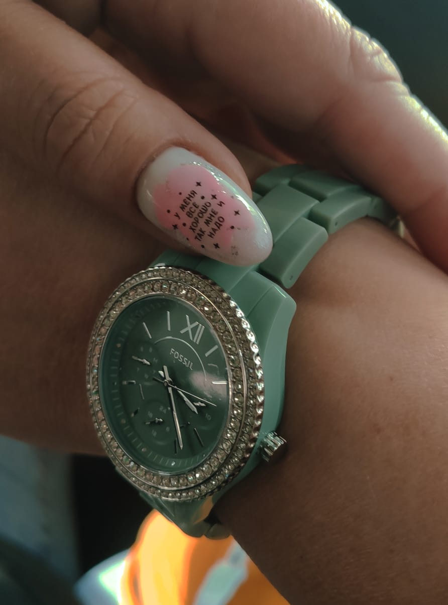 Модель элегантная ,приятного мятного цвета, безель украшен кристаллами. Стрелки светятся в темноте. Дата и день недели отображаются на отдельных циферблатах. Часы шли в брендовой коробке, гарантийный талон был вложен. Доставили быстро.