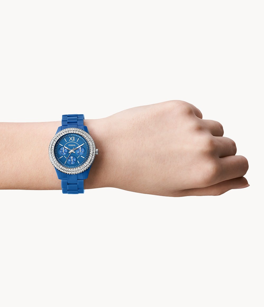 Женские американские часы с паве из кристаллов Fossil Stella ES5193, кварцевый механизм с высокой точностью. Класс водозащиты: 50 метров, позволит защитить корпус от случайных брызг или капель дождя. Круглый корпус часов изготовлен из пластика синего цвета. БезельБезельВнешний ободок, закрепляющий стекло. В спортивных часах так называется поворотное кольцо с делениями на циферблате, выполняет роль таймера – замеряет отрезки времени на шкале. Неподвижный безель – элемент декора. Однонаправленно вращающийся безель на дайверских часах позволяет фиксировать моменты погружения и выныривания на поверхность. украшен паве из кристаллов. Метки в виде штрихов, 12-ти часовая метка в виде римской цифры. 24 индикация, дата и день недели вынесены на малые циферблаты. Рифленая заводная головка. Браслет пластиковый синего цвета.