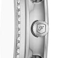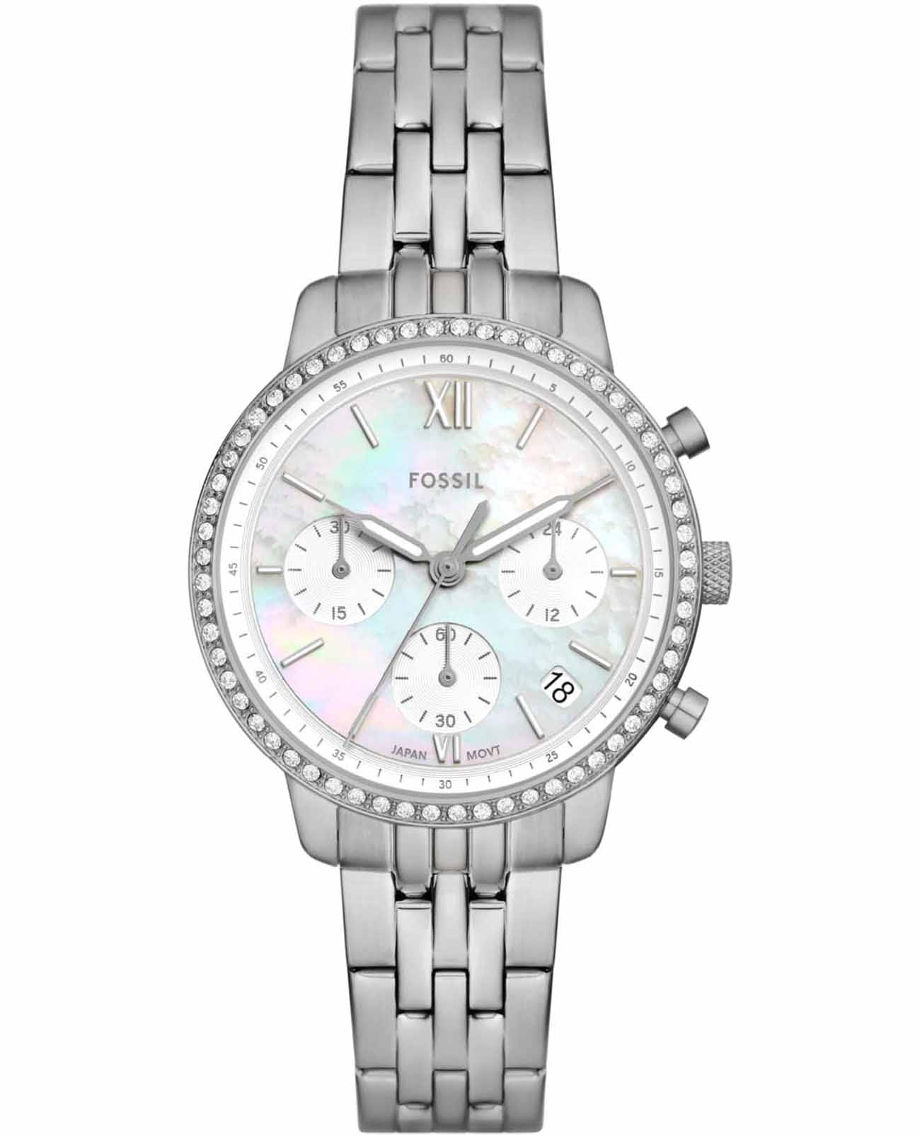 Fossil ES5357 – это изысканные женские часы-хронографХронографФункция позволяет измерять отрезки времени с особой точностью: часы, минуты, секунды. Верным признаком хронографа является наличие на циферблате 3 дополнительных окошек-счётчиков. с секундомеромСекундомерСекундоме́р — прибор, способный измерять интервалы времени с точностью до долей секунды., которые станут идеальным дополнением к вашему стилю, предлагая баланс между функциональностью и эстетикой. Эти часы изготовлены в США и оснащены надежным кварцевым механизмом, что обеспечивает точность и долговечность. Корпус часов выполнен из прочной стали, а безельБезельВнешний ободок, закрепляющий стекло. В спортивных часах так называется поворотное кольцо с делениями на циферблате, выполняет роль таймера – замеряет отрезки времени на шкале. Неподвижный безель – элемент декора. Однонаправленно вращающийся безель на дайверских часах позволяет фиксировать моменты погружения и выныривания на поверхность. украшен кристаллами, добавляя блеска и шарма. Белый перламутровый циферблат гармонично сочетается с маркировкой в виде штрихов и римскими цифрами VI и XII, придавая часам классический вид. Окошко даты, расположенное между отметками 4 и 5 часов, добавляет удобства в повседневном использовании. Часы обладают водозащитой 50WR, что позволяет не беспокоиться о случайных попаданиях влаги. Минеральное стеклоМинеральное стеклоМинеральное стекло представляет собой искусственно выращенный минерал кварца. Такое стекло отличается особой устойчивостью к повреждениям и царапинам. Уступает по некоторым качествам сапфировому стеклу. защищает циферблат от царапин и повреждений. Стрелки с люминесцентным покрытиемЛюминесцентное покрытиеПозволяет считывать показания времени в темноте. Производители наносят на стрелки, часовые индексы, безель или поверхность циферблата светонакопительный состав, дающий холодное свечение. позволяют легко считывать время даже в условиях низкой освещенности. Стальной браслет с раскладной застёжкойРаскладная застёжкаТакой тип застёжки используется только на браслетах из металла. Она никогда не раскрывается полностью, происходит разделение на 2 и более частей. Раскладывающая застёжка снизит вероятность потери часов к минимуму. обеспечивает комфортное ношение и надежную фиксацию на запястье, с габаритными размерами 36 мм в диаметре, шириной браслета 16 мм и длиной 175 мм. Эти часы — прекрасный выбор для тех, кто ценит стиль и качество в каждом элементе аксессуара.