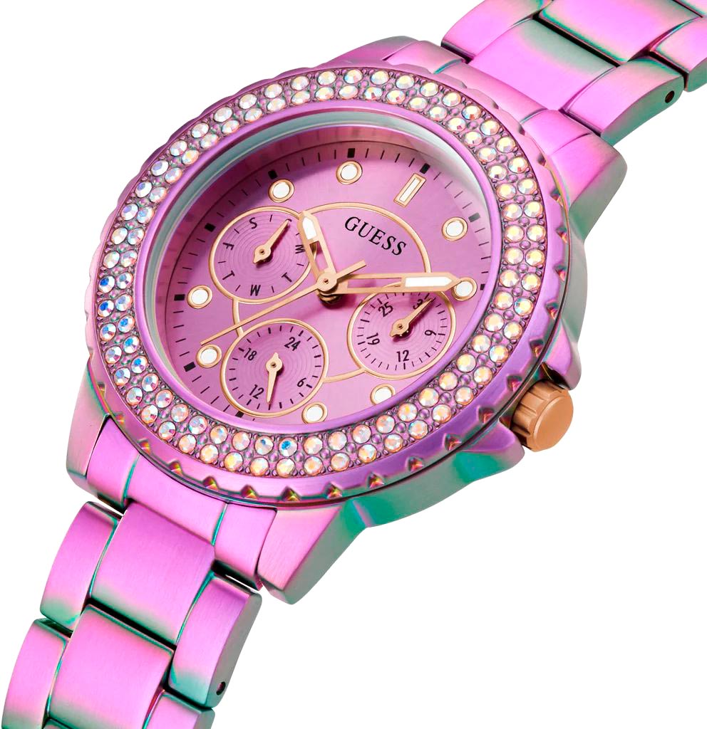 Женские наручные часы Guess Sport Steel GW0410L4 с минеральным стекломМинеральное стеклоМинеральное стекло представляет собой искусственно выращенный минерал кварца. Такое стекло отличается особой устойчивостью к повреждениям и царапинам. Уступает по некоторым качествам сапфировому стеклу., кварцевый механизм с высокой точностью. 12-ти и 24-х часовой формат времени, число и день недели вынесены на отдельные циферблаты. Метки в виде точек. Класс водозащиты: 30 метров, позволит защитить корпус от случайных брызг или капель дождя. Корпус часов изготовлен из стали с IP-покрытиемIP-покрытиеМетод ионного напыления. Демонстрирует повышенную устойчивость к истиранию, окислению и химическим веществам. Под воздействием высокого давления и температуры около 1500°C молекулы металла надёжно соединяются с частицами корпуса часов.. Браслет с раскладной застёжкойРаскладная застёжкаТакой тип застёжки используется только на браслетах из металла. Она никогда не раскрывается полностью, происходит разделение на 2 и более частей. Раскладывающая застёжка снизит вероятность потери часов к минимуму..