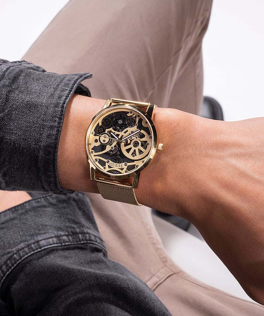 Мужские наручные часы с минеральным стекломМинеральное стеклоМинеральное стекло представляет собой искусственно выращенный минерал кварца. Такое стекло отличается особой устойчивостью к повреждениям и царапинам. Уступает по некоторым качествам сапфировому стеклу. Guess Gadget GW0538G2, кварцевый механизм с высокой точностью. Класс водозащиты: 50 метров, позволит защитить корпус от случайных брызг или капель дождя. Корпус часов изготовлен из стали с IP-покрытиемIP-покрытиеМетод ионного напыления. Демонстрирует повышенную устойчивость к истиранию, окислению и химическим веществам. Под воздействием высокого давления и температуры около 1500°C молекулы металла надёжно соединяются с частицами корпуса часов.. Стальной браслет на раскладной застёжкеРаскладная застёжкаТакой тип застёжки используется только на браслетах из металла. Она никогда не раскрывается полностью, происходит разделение на 2 и более частей. Раскладывающая застёжка снизит вероятность потери часов к минимуму. с IP-покрытиемIP-покрытиеМетод ионного напыления. Демонстрирует повышенную устойчивость к истиранию, окислению и химическим веществам. Под воздействием высокого давления и температуры около 1500°C молекулы металла надёжно соединяются с частицами корпуса часов..