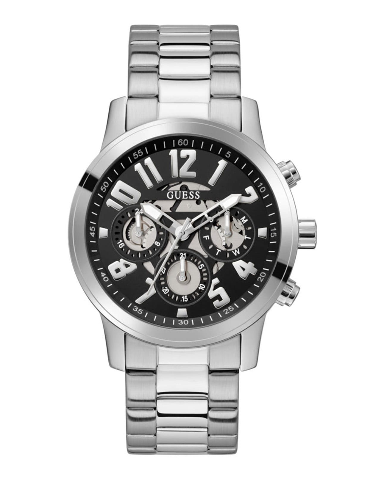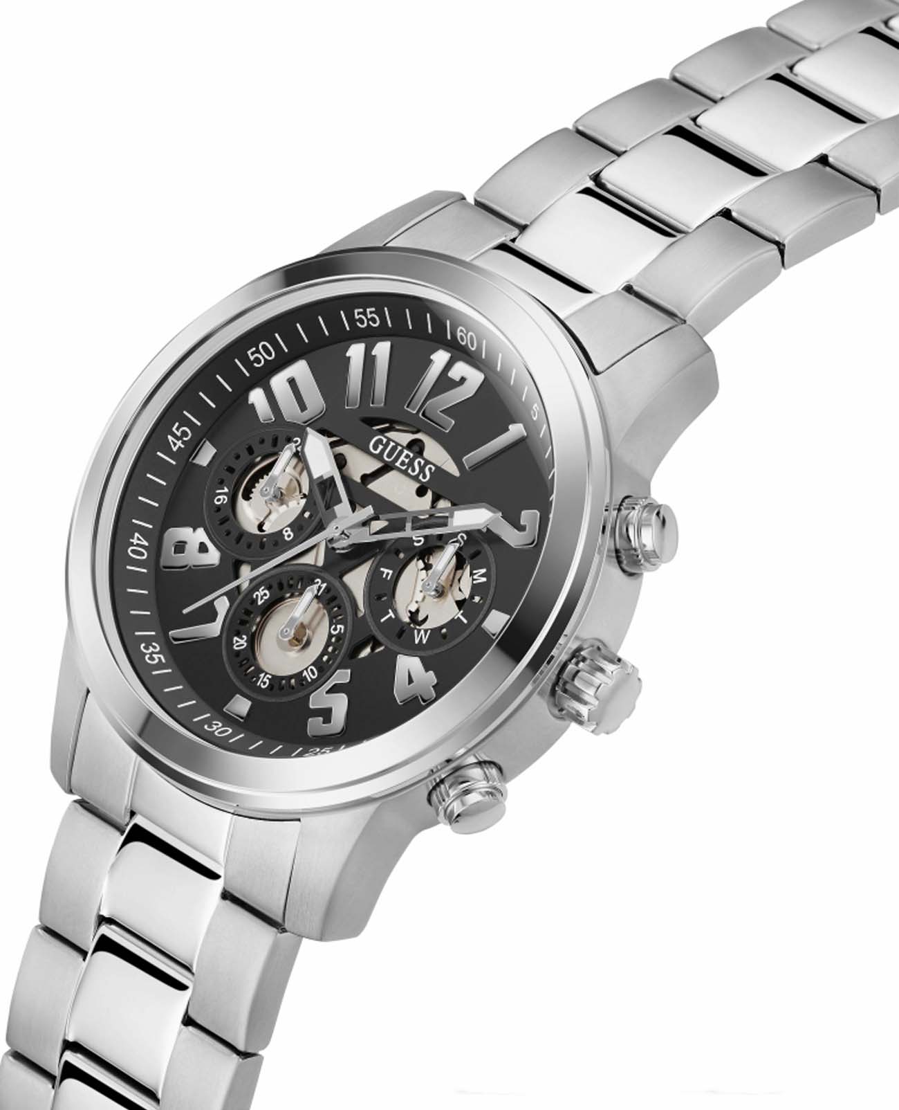Мужские наручные часы с минеральным стекломМинеральное стеклоМинеральное стекло представляет собой искусственно выращенный минерал кварца. Такое стекло отличается особой устойчивостью к повреждениям и царапинам. Уступает по некоторым качествам сапфировому стеклу. Guess Dress  GW0627G1, кварцевый механизм с высокой точностью. Корпус часов изготовлен из стали. 24-х часовой формат времени, число и день недели отображаются на отдельных циферблатах. Метки в виде арабских цифр. Рифленая заводная головка. Стрелки с люминесцентным покрытиемЛюминесцентное покрытиеПозволяет считывать показания времени в темноте. Производители наносят на стрелки, часовые индексы, безель или поверхность циферблата светонакопительный состав, дающий холодное свечение.. Класс водозащиты: 50 метров, позволит защитить корпус от случайных брызг или капель дождя. Стальной браслет на раскладной застёжкеРаскладная застёжкаТакой тип застёжки используется только на браслетах из металла. Она никогда не раскрывается полностью, происходит разделение на 2 и более частей. Раскладывающая застёжка снизит вероятность потери часов к минимуму..