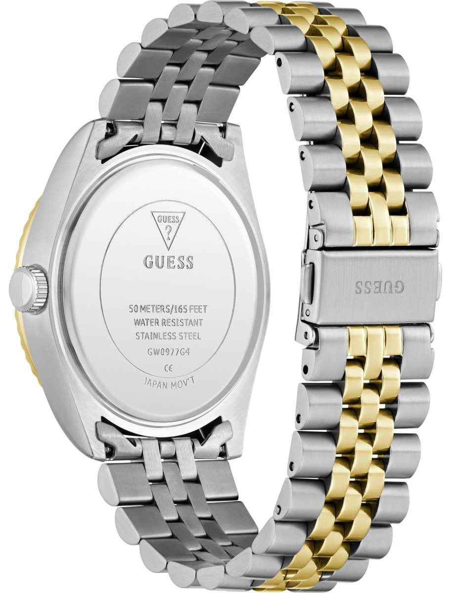Мужские наручные часы Guess Dress Jaden GW0977G4 – это сочетание элегантности и современного стиля. Изысканные часы оснащены надежным кварцевым механизмом, который обеспечивает точность хода. Корпус часов выполнен из нержавеющей стали с безелемБезельВнешний ободок, закрепляющий стекло. В спортивных часах так называется поворотное кольцо с делениями на циферблате, выполняет роль таймера – замеряет отрезки времени на шкале. Неподвижный безель – элемент декора. Однонаправленно вращающийся безель на дайверских часах позволяет фиксировать моменты погружения и выныривания на поверхность. с IP-покрытиемIP-покрытиеМетод ионного напыления. Демонстрирует повышенную устойчивость к истиранию, окислению и химическим веществам. Под воздействием высокого давления и температуры около 1500°C молекулы металла надёжно соединяются с частицами корпуса часов. диаметром 42 мм и толщиной 11 мм, придающий модели особый характер. Циферблат оснащен метками в виде штрихов. Вынесенный циферблат с 24-х часовым указателем времени. Окошко даты в позиции 3 часов. Люминесцентное покрытиеЛюминесцентное покрытиеПозволяет считывать показания времени в темноте. Производители наносят на стрелки, часовые индексы, безель или поверхность циферблата светонакопительный состав, дающий холодное свечение. на стрелках и метках обеспечивает отличную видимость в темноте. Стильный стальной браслет с IP-покрытиемIP-покрытиеМетод ионного напыления. Демонстрирует повышенную устойчивость к истиранию, окислению и химическим веществам. Под воздействием высокого давления и температуры около 1500°C молекулы металла надёжно соединяются с частицами корпуса часов. с раскладной застежкойРаскладная застёжкаТакой тип застёжки используется только на браслетах из металла. Она никогда не раскрывается полностью, происходит разделение на 2 и более частей. Раскладывающая застёжка снизит вероятность потери часов к минимуму. гарантирует комфортное ношение и надежную фиксацию. Минеральное стеклоМинеральное стеклоМинеральное стекло представляет собой искусственно выращенный минерал кварца. Такое стекло отличается особой устойчивостью к повреждениям и царапинам. Уступает по некоторым качествам сапфировому стеклу. защищает циферблат от царапин, а водозащита 50WR предохраняет часы от случайных брызг и дождя. Эта модель станет отличным выбором для тех, кто ценит стиль и функциональность в одном аксессуаре.