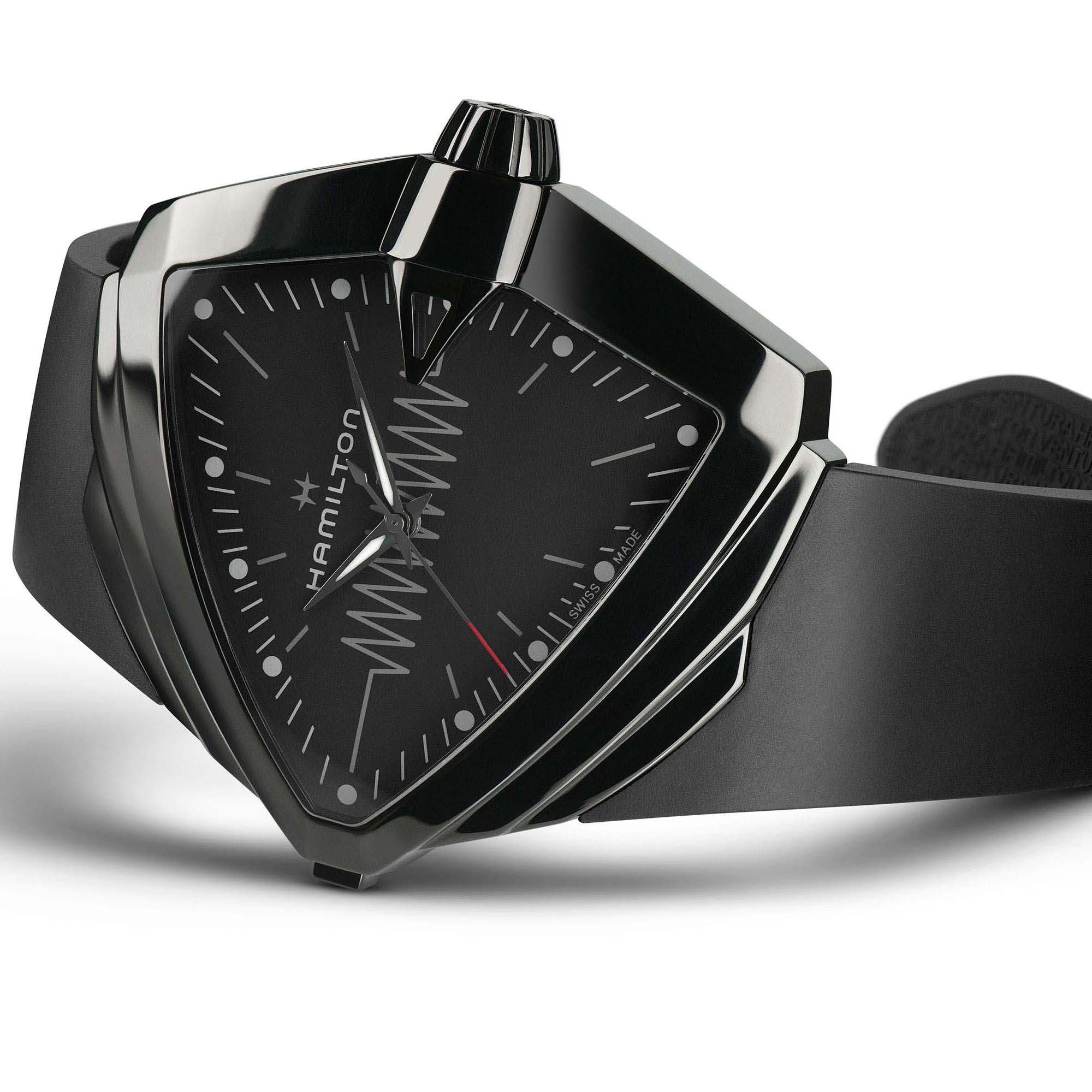 Hamilton Ventura XXL Bright – культовая модель, сочетающая в себе смелый футуристический дизайн и передовые технологии. Корпус из нержавеющей стали с PVDPVDУльтратонкое покрытие наносится в технике вакуумного напыления, сочетает в себе нитрид титана особой прочности со слоем золота или оксида хрома. Несёт в себе декоративную или защитную функцию.-покрытием придаёт глубокий чёрный оттенок и дополнительную защиту от царапин, а сапфировое стеклоСапфировое стеклоПрочный и надёжный материал из кристалла сапфира синтетического происхождения, характеризующийся особой твёрдостью и устойчивостью к царапинам и повреждениям. гарантирует безупречную читаемость циферблата. Надёжный механизм обеспечивает точность хода, а чёрный каучуковый ремешок добавляет удобства в повседневном ношении. Люминесцентное покрытиеЛюминесцентное покрытиеПозволяет считывать показания времени в темноте. Производители наносят на стрелки, часовые индексы, безель или поверхность циферблата светонакопительный состав, дающий холодное свечение. на стрелках и маркерах позволяет считывать время даже в полной темноте. Водонепроницаемость до 50 метров защищает часы от брызг и дождя, делая их отличным выбором для активного образа жизни.