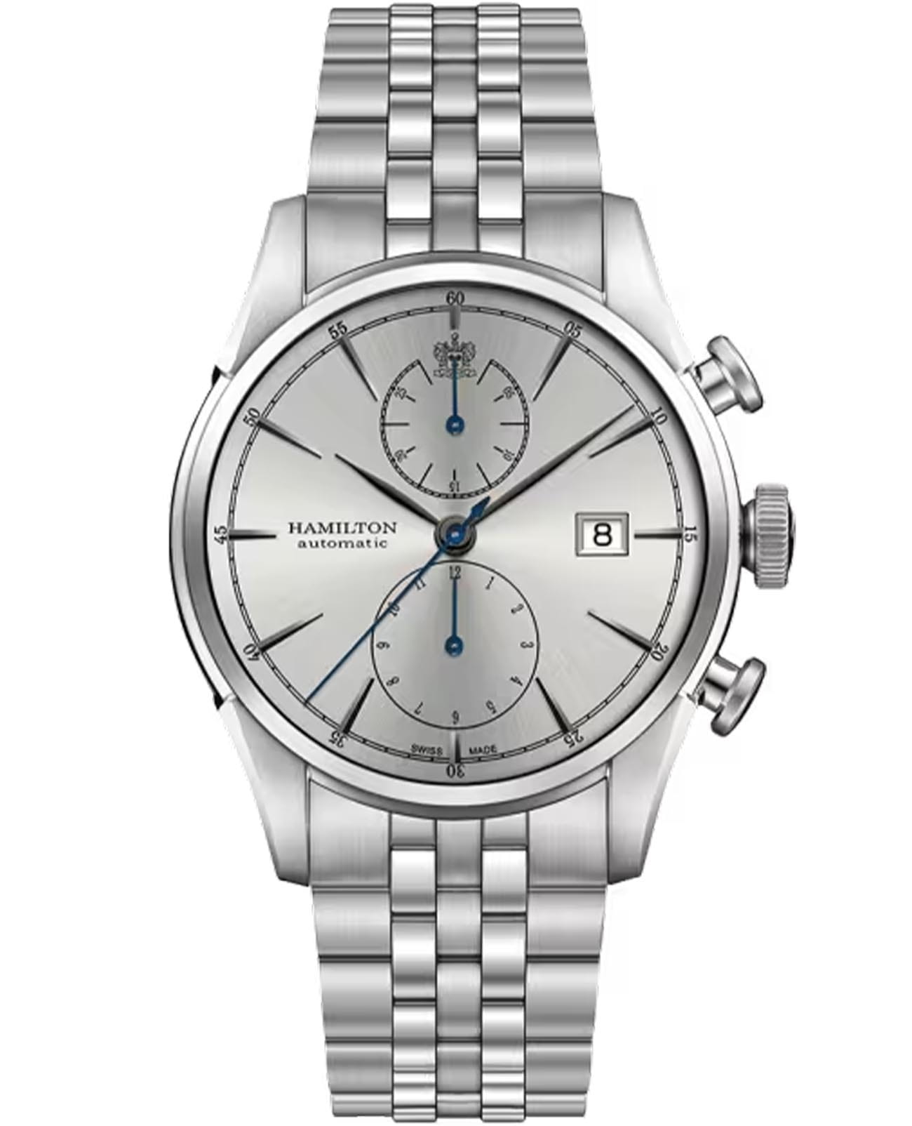 Мужские механические часы Hamilton American Classic Spirit of Liberty Auto Chrono H32416981 c хронографомХронографФункция позволяет измерять отрезки времени с особой точностью: часы, минуты, секунды. Верным признаком хронографа является наличие на циферблате 3 дополнительных окошек-счётчиков.. Сапфировое стеклоСапфировое стеклоПрочный и надёжный материал из кристалла сапфира синтетического происхождения, характеризующийся особой твёрдостью и устойчивостью к царапинам и повреждениям. устойчивое к появлению царапин, обладающее высокой прозрачностью. Класс водозащиты: 50 метров, позволит защитить корпус от случайных брызг или капель дождя. Корпус часов изготовлен из нержавеющей стали. Стальной браслет на застёжке-бабочке с кнопкамиЗастёжка "бабочка"Такой вид застёжки дополняется предохранителями, помогающими избежать случайного раскрытия браслета. Обладают изящным исполнением. . Окошко даты находится в положении 3 часа.