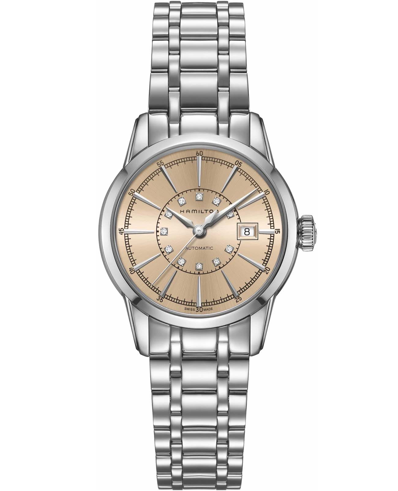 Женские наручные часы Hamilton American Classic RailRoad Lady Auto H40405121 с автоматическим механизмом. Корпус и браслет часов изготовлены из нержавеющей стали. Сапфировое стеклоСапфировое стеклоПрочный и надёжный материал из кристалла сапфира синтетического происхождения, характеризующийся особой твёрдостью и устойчивостью к царапинам и повреждениям. устойчивое к мелким механическим повреждениям. Стальной браслет на застёжке-бабочке с кнопкамиЗастёжка "бабочка"Такой вид застёжки дополняется предохранителями, помогающими избежать случайного раскрытия браслета. Обладают изящным исполнением. . Циферблат часов инкрустирован бриллиантами. Окошко даты находится в положении 3 часа.