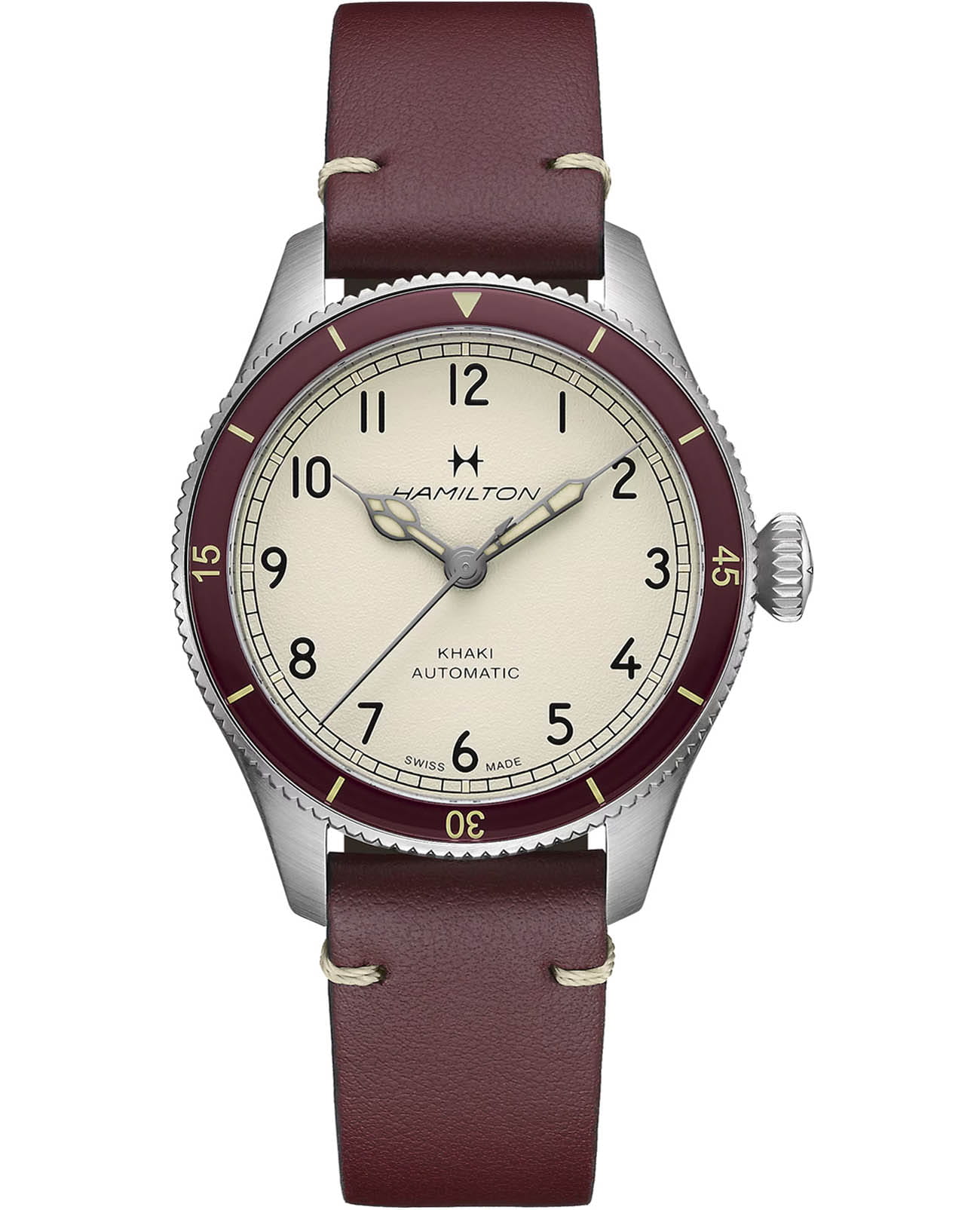 Мужские стильные швейцарские часы Hamilton Khaki Aviation Pilot Pioneer Auto 38mm H76265810. Корпус из нержавеющей стали диаметром 38 мм с изысканным дизайном и толщиной 11.4 мм подчеркивает элегантность модели, поворотный безельБезельВнешний ободок, закрепляющий стекло. В спортивных часах так называется поворотное кольцо с делениями на циферблате, выполняет роль таймера – замеряет отрезки времени на шкале. Неподвижный безель – элемент декора. Однонаправленно вращающийся безель на дайверских часах позволяет фиксировать моменты погружения и выныривания на поверхность. изготовлен из стали с IP-покрытиемIP-покрытиеМетод ионного напыления. Демонстрирует повышенную устойчивость к истиранию, окислению и химическим веществам. Под воздействием высокого давления и температуры около 1500°C молекулы металла надёжно соединяются с частицами корпуса часов., а сапфировое стеклоСапфировое стеклоПрочный и надёжный материал из кристалла сапфира синтетического происхождения, характеризующийся особой твёрдостью и устойчивостью к царапинам и повреждениям. с антибликовым покрытиемАнтибликовое покрытиеСлой оксида металла в 0,13-0,3 микрон, благодаря которому стекло часов не бликует и не отражает свет. Антибликовое покрытие уменьшает отражение света в 10 раз, обеспечивая отличную читаемость показателей циферблата. обеспечивает превосходную читаемость лаконичного циферблата со стрелками с люминесцентным покрытиемЛюминесцентное покрытиеПозволяет считывать показания времени в темноте. Производители наносят на стрелки, часовые индексы, безель или поверхность циферблата светонакопительный состав, дающий холодное свечение. Super-LumiNova®. Механизм с автоматическим подзаводом H-10. Пружина баланса Nivachron™Nivachron™Специально разработанный инновационный сплав Nivachron™ повышает устойчивость часов к воздействию магнитных полей. гарантирует точность хода, устойчивость к магнитным полям, обеспечивает запас хода 80 часов. Изысканный ремешок выполнен из кожи со стандартной застежкой, гарантирующей комфортное ношение и безопасность. Водонепроницаемость часов достигает 10 атмосфер (100 метров), делающая их подходящими для повседневного использования и активного отдыха. Это сочетание высокой прочности, точности и изысканного дизайна для уверенных в себе мужчин.