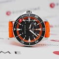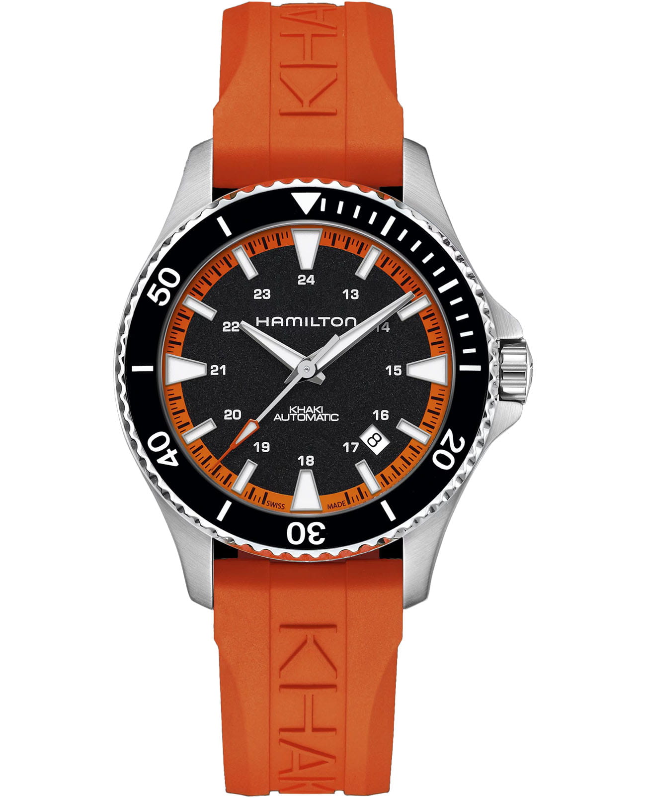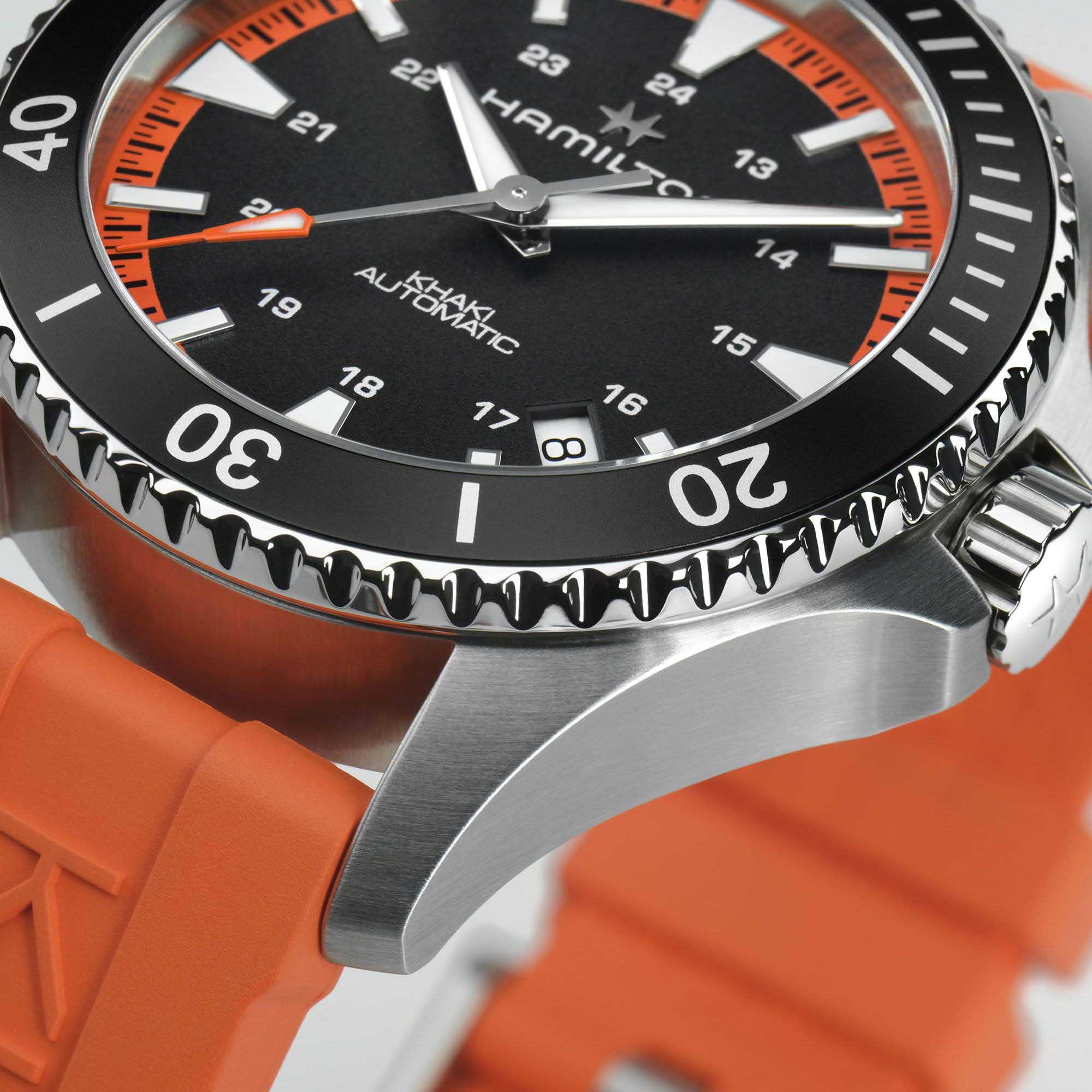 На пляже, у бассейна или в океанских глубинах: новая модель Khaki Navy Scuba гарантированно произведет фурор. Часы для современных мореплавателей, любителей подводного плавания, серфинга и пляжного отдыха с оранжевым каучуковым ремешком и контрастным черным циферблатом сочетают в себе эффектный дизайн и функциональность. Независимо от того, хронометрируете ли вы время плавания, бега или пребывания на солнце, они позаботятся о том, чтобы вы сохраняли спокойствие даже при высоких температурах. Сапфировое стеклоСапфировое стеклоПрочный и надёжный материал из кристалла сапфира синтетического происхождения, характеризующийся особой твёрдостью и устойчивостью к царапинам и повреждениям. устойчивое к появлению царапин, обладающее высокой прозрачностью. Водозащита: 100 метров, позволит плавать, нырять и заниматься другими водными видами спорта.