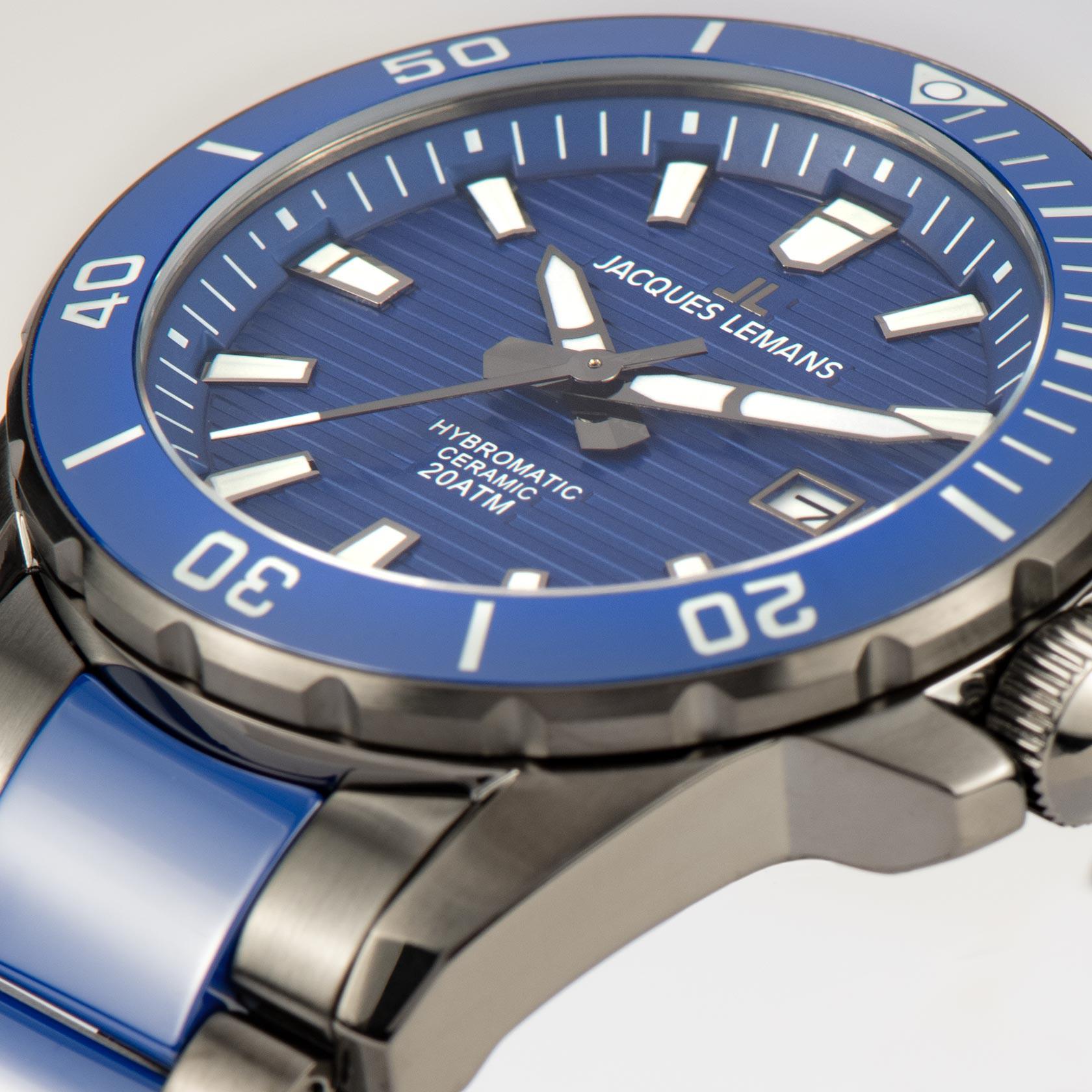 Мужские часы Jacques Lemans Venice 1-2222C с сапфировым стекломСапфировое стеклоПрочный и надёжный материал из кристалла сапфира синтетического происхождения, характеризующийся особой твёрдостью и устойчивостью к царапинам и повреждениям., гибрид кварца и механики с автоподзаводом. Лимитированная серия революционных часов Hybromatic: всего выпущено 999 штук каждой модели. Вращающийся безельБезельВнешний ободок, закрепляющий стекло. В спортивных часах так называется поворотное кольцо с делениями на циферблате, выполняет роль таймера – замеряет отрезки времени на шкале. Неподвижный безель – элемент декора. Однонаправленно вращающийся безель на дайверских часах позволяет фиксировать моменты погружения и выныривания на поверхность. из нержавеющей стали с PVDPVDУльтратонкое покрытие наносится в технике вакуумного напыления, сочетает в себе нитрид титана особой прочности со слоем золота или оксида хрома. Несёт в себе декоративную или защитную функцию. покрытием. Стрелки и метки с люминесцентным покрытиемЛюминесцентное покрытиеПозволяет считывать показания времени в темноте. Производители наносят на стрелки, часовые индексы, безель или поверхность циферблата светонакопительный состав, дающий холодное свечение.. Окошко даты расположено в позиции «3 часа». Класс водозащиты: 200 метров, позволит плавать, нырять и заниматься другими водными видами спорта. Прозрачная задняя крышка позволит в подробностях разглядеть необычный механизм. Браслет из нержавеющей стали с PVDPVDУльтратонкое покрытие наносится в технике вакуумного напыления, сочетает в себе нитрид титана особой прочности со слоем золота или оксида хрома. Несёт в себе декоративную или защитную функцию. покрытием и высокотехнологичной керамикиВысокотехнологичная керамикаИнновационный запатентованный Rado материал с гладкой или матовой поверхностью. Керамика за счёт кристаллической структуры обладает повышенной устойчивостью от возникновения царапин. Материал способен принимать температуру тела человека, обеспечивая невероятный комфорт при ношении. на раскладной застёжкеРаскладная застёжкаТакой тип застёжки используется только на браслетах из металла. Она никогда не раскрывается полностью, происходит разделение на 2 и более частей. Раскладывающая застёжка снизит вероятность потери часов к минимуму..