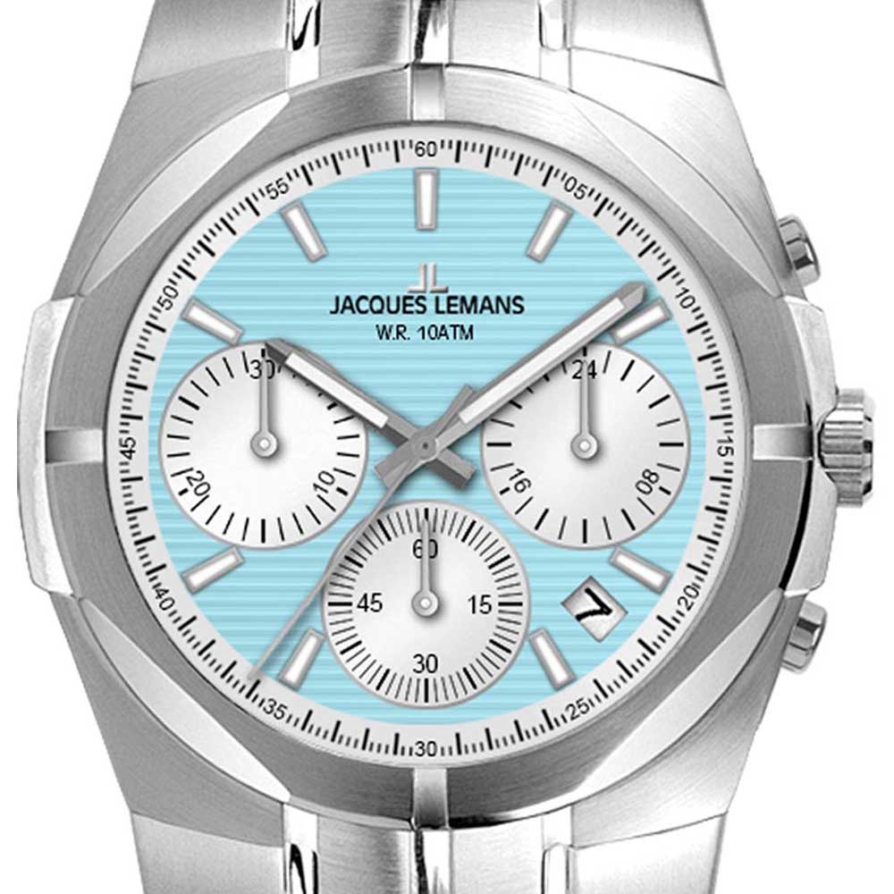 Женские кварцевые часы-хронографХронографФункция позволяет измерять отрезки времени с особой точностью: часы, минуты, секунды. Верным признаком хронографа является наличие на циферблате 3 дополнительных окошек-счётчиков. Jacques Lemans 1-2183F с минеральным стекломМинеральное стеклоМинеральное стекло представляет собой искусственно выращенный минерал кварца. Такое стекло отличается особой устойчивостью к повреждениям и царапинам. Уступает по некоторым качествам сапфировому стеклу.. Корпус выполнен из нержавеющей стали. Стрелки и метки с люминесцентным покрытиемЛюминесцентное покрытиеПозволяет считывать показания времени в темноте. Производители наносят на стрелки, часовые индексы, безель или поверхность циферблата светонакопительный состав, дающий холодное свечение.. Окошко даты находится в положении между 4 и 5 часами. Класс водозащиты: 100 метров, позволит плавать, нырять и заниматься другими водными видами спорта.