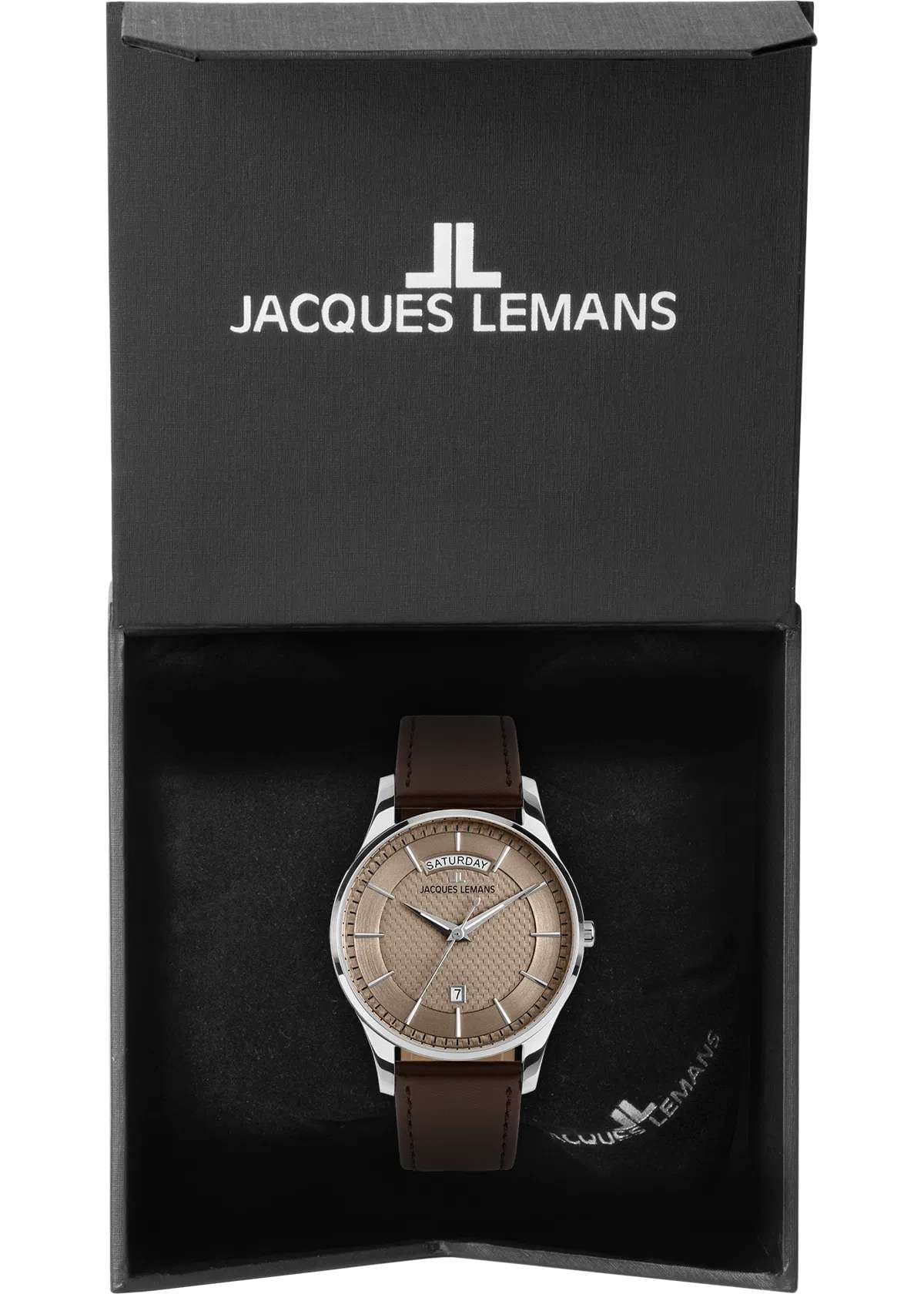 Мужские часы Jacques Lemans 1-2193K – лаконичная красота и изысканная элегантность. Оригинальная модель с классическим оформлением станет превосходным завершением образа, наделив его индивидуальным характером. Корпус выполнен из нержавеющей стали, диаметром 40 мм, что обеспечивает долговечность и утончённый внешний вид. Ударопрочное минеральное стеклоМинеральное стеклоМинеральное стекло представляет собой искусственно выращенный минерал кварца. Такое стекло отличается особой устойчивостью к повреждениям и царапинам. Уступает по некоторым качествам сапфировому стеклу. Crystex защищает циферблат от царапин. Кожаный ремешок на стандартной застёжке обеспечивает комфортное ношение. Водозащита 50 метров защищает часы от брызг и дождя, делая их подходящими для повседневного использования. Стрелки с люминесцентным покрытиемЛюминесцентное покрытиеПозволяет считывать показания времени в темноте. Производители наносят на стрелки, часовые индексы, безель или поверхность циферблата светонакопительный состав, дающий холодное свечение. позволяющие легко определять время даже в темноте. Окошко даты находится в положении 6 часов. Широкое окошко дня недели в положении 12 часов позволяет показывать название дня недели полностью, без сокращений. Это аксессуар для мужчины, который ценит классический стиль и функциональность.