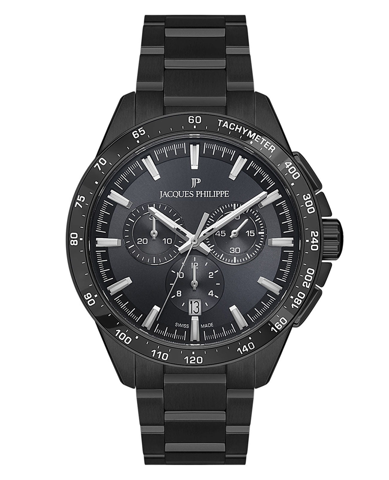 Швейцарские мужские часы-хронографХронографФункция позволяет измерять отрезки времени с особой точностью: часы, минуты, секунды. Верным признаком хронографа является наличие на циферблате 3 дополнительных окошек-счётчиков. с секундомеромСекундомерСекундоме́р — прибор, способный измерять интервалы времени с точностью до долей секунды. Jacques Philippe Magnificus JPQGC254341, кварцевый механизм с высокой точностью. Сапфировое стеклоСапфировое стеклоПрочный и надёжный материал из кристалла сапфира синтетического происхождения, характеризующийся особой твёрдостью и устойчивостью к царапинам и повреждениям. устойчивое к появлению царапин, обладающее высокой прозрачностью. Корпус часов изготовлен из нержавеющей стали с IP-покрытиемIP-покрытиеМетод ионного напыления. Демонстрирует повышенную устойчивость к истиранию, окислению и химическим веществам. Под воздействием высокого давления и температуры около 1500°C молекулы металла надёжно соединяются с частицами корпуса часов.. БезельБезельВнешний ободок, закрепляющий стекло. В спортивных часах так называется поворотное кольцо с делениями на циферблате, выполняет роль таймера – замеряет отрезки времени на шкале. Неподвижный безель – элемент декора. Однонаправленно вращающийся безель на дайверских часах позволяет фиксировать моменты погружения и выныривания на поверхность. с тахиметромТахиметрРазмеченная шкала, располагается на ободке или безеле часов. Тахиметр позволяет рассчитать скорость на определённом участке пути, расстояние измеряется в километрах или милях.. На циферблате три дополнительных индикатора. Окошко даты находится в положении 6 часов. Стрелки с люминесцентным покрытиемЛюминесцентное покрытиеПозволяет считывать показания времени в темноте. Производители наносят на стрелки, часовые индексы, безель или поверхность циферблата светонакопительный состав, дающий холодное свечение.. Класс водозащиты: 100 метров, позволит плавать, нырять и заниматься другими водными видами спорта. Стальной браслет с IP-покрытиемIP-покрытиеМетод ионного напыления. Демонстрирует повышенную устойчивость к истиранию, окислению и химическим веществам. Под воздействием высокого давления и температуры около 1500°C молекулы металла надёжно соединяются с частицами корпуса часов. на застёжке «бабочка» с кнопкамиЗастёжка "бабочка"Такой вид застёжки дополняется предохранителями, помогающими избежать случайного раскрытия браслета. Обладают изящным исполнением. .