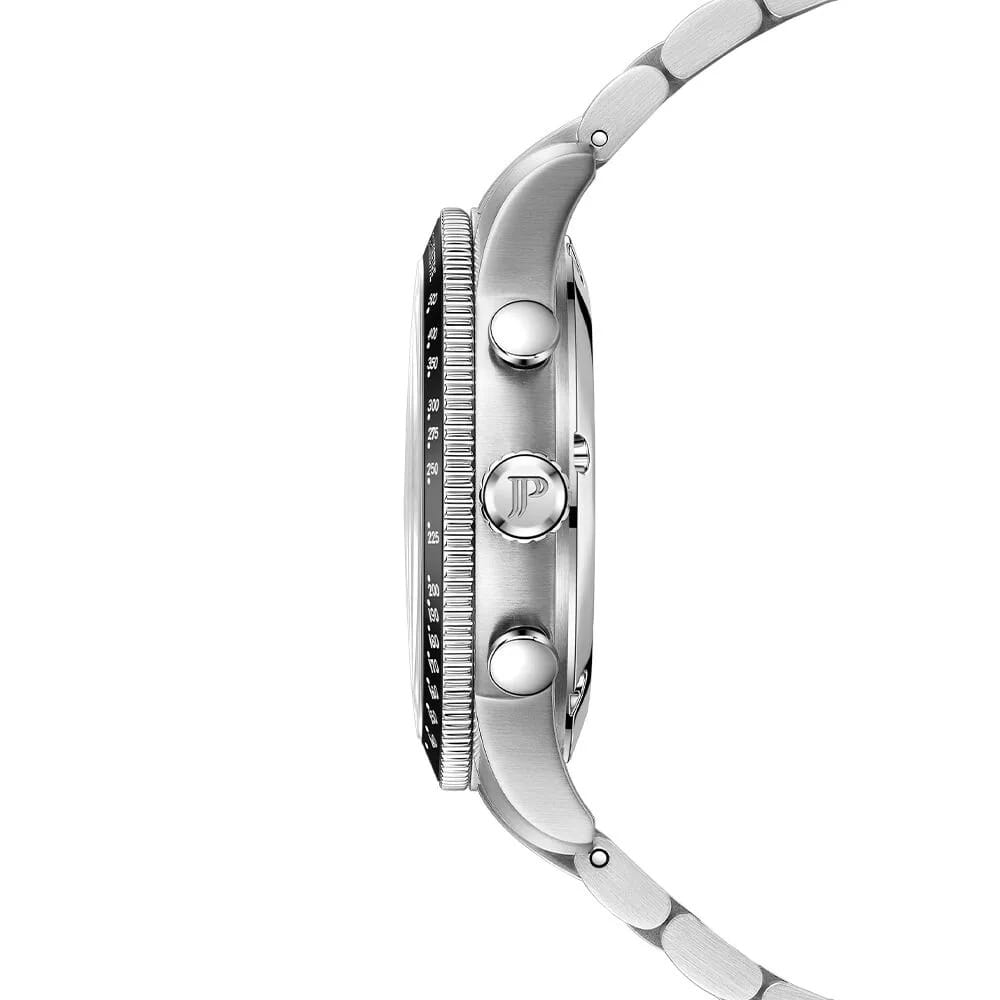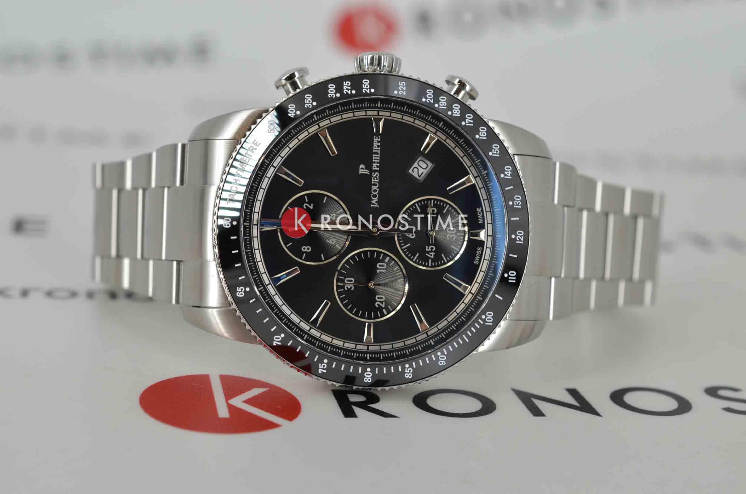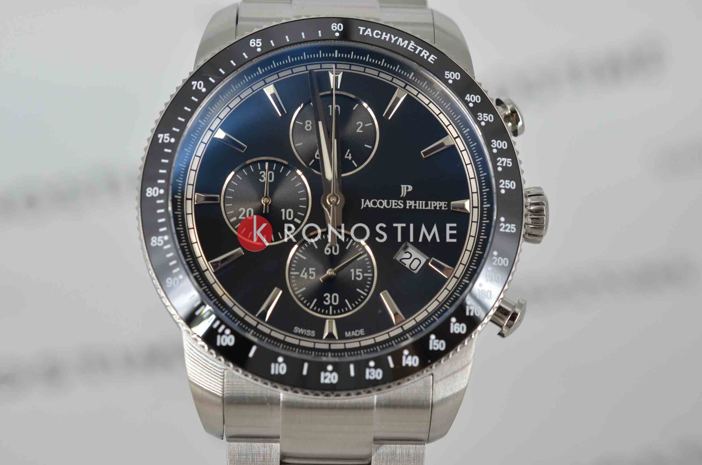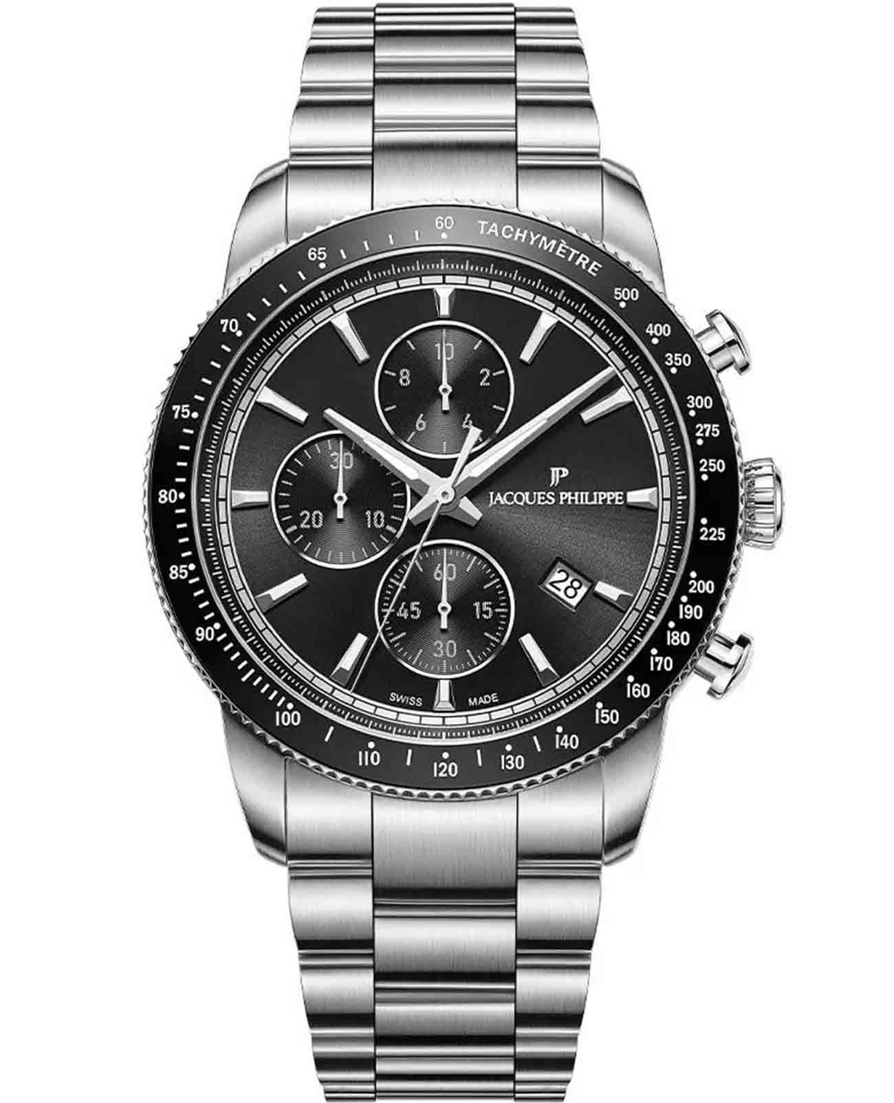 Швейцарские наручные часы Jacques Philippe JPQGC691316 сочетают в себе современный дизайн, надежность и функциональность, это стильные швейцарские часы с функцией хронографаХронографФункция позволяет измерять отрезки времени с особой точностью: часы, минуты, секунды. Верным признаком хронографа является наличие на циферблате 3 дополнительных окошек-счётчиков. и секундомераСекундомерСекундоме́р — прибор, способный измерять интервалы времени с точностью до долей секунды.. Корпус круглой формы диаметром 42 мм выполнен из прочной нержавеющей стали, а безельБезельВнешний ободок, закрепляющий стекло. В спортивных часах так называется поворотное кольцо с делениями на циферблате, выполняет роль таймера – замеряет отрезки времени на шкале. Неподвижный безель – элемент декора. Однонаправленно вращающийся безель на дайверских часах позволяет фиксировать моменты погружения и выныривания на поверхность. с элегантным черным IP-покрытиемIP-покрытиеМетод ионного напыления. Демонстрирует повышенную устойчивость к истиранию, окислению и химическим веществам. Под воздействием высокого давления и температуры около 1500°C молекулы металла надёжно соединяются с частицами корпуса часов.. Сапфировое стеклоСапфировое стеклоПрочный и надёжный материал из кристалла сапфира синтетического происхождения, характеризующийся особой твёрдостью и устойчивостью к царапинам и повреждениям. с антибликовым покрытиемАнтибликовое покрытиеСлой оксида металла в 0,13-0,3 микрон, благодаря которому стекло часов не бликует и не отражает свет. Антибликовое покрытие уменьшает отражение света в 10 раз, обеспечивая отличную читаемость показателей циферблата. надежно защищает черный циферблат от царапин и повреждений. Модель оснащена точным кварцевым механизмом, а также дополнительными функциями — тахиметромТахиметрРазмеченная шкала, располагается на ободке или безеле часов. Тахиметр позволяет рассчитать скорость на определённом участке пути, расстояние измеряется в километрах или милях. и индикатором даты, что делает часы не только стильным аксессуаром, но и практичным помощником на каждый день. Серебряный браслет шириной 22 мм удобно фиксируется на запястье с помощью застежки «бабочка»Застёжка "бабочка"Такой вид застёжки дополняется предохранителями, помогающими избежать случайного раскрытия браслета. Обладают изящным исполнением. . Стрелки имеют люминесцентное покрытиеЛюминесцентное покрытиеПозволяет считывать показания времени в темноте. Производители наносят на стрелки, часовые индексы, безель или поверхность циферблата светонакопительный состав, дающий холодное свечение. для удобства чтения времени в темноте. Водозащита 5 АТМ позволяет не снимать часы при дожде и случайных контактах с водой.