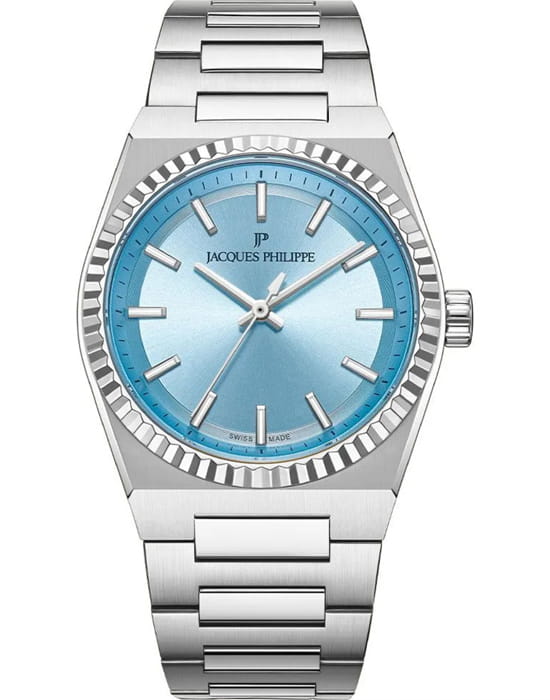 Часы Jacques Philippe JPQGLS5813X6LB из коллекции Borealis — элегантные женские часы, сочетающие в себе швейцарское качество и современный дизайн. Корпус диаметром 34 мм выполнен из нержавеющей стали, а голубой циферблат защищён сапфировым стекломСапфировое стеклоПрочный и надёжный материал из кристалла сапфира синтетического происхождения, характеризующийся особой твёрдостью и устойчивостью к царапинам и повреждениям.. Внутри установлен швейцарский кварцевый механизм, обеспечивающий высокую точность хода. Водозащита 50 метров (5 ATM) защищает часы от брызг и дождя. Браслет из нержавеющей стали с застёжкой бабочкаЗастёжка "бабочка"Такой вид застёжки дополняется предохранителями, помогающими избежать случайного раскрытия браслета. Обладают изящным исполнением. обеспечивает комфортное ношение и надёжную фиксацию на запястье. Эти часы подойдут для тех, кто ценит сочетание элегантного дизайна и функциональности.