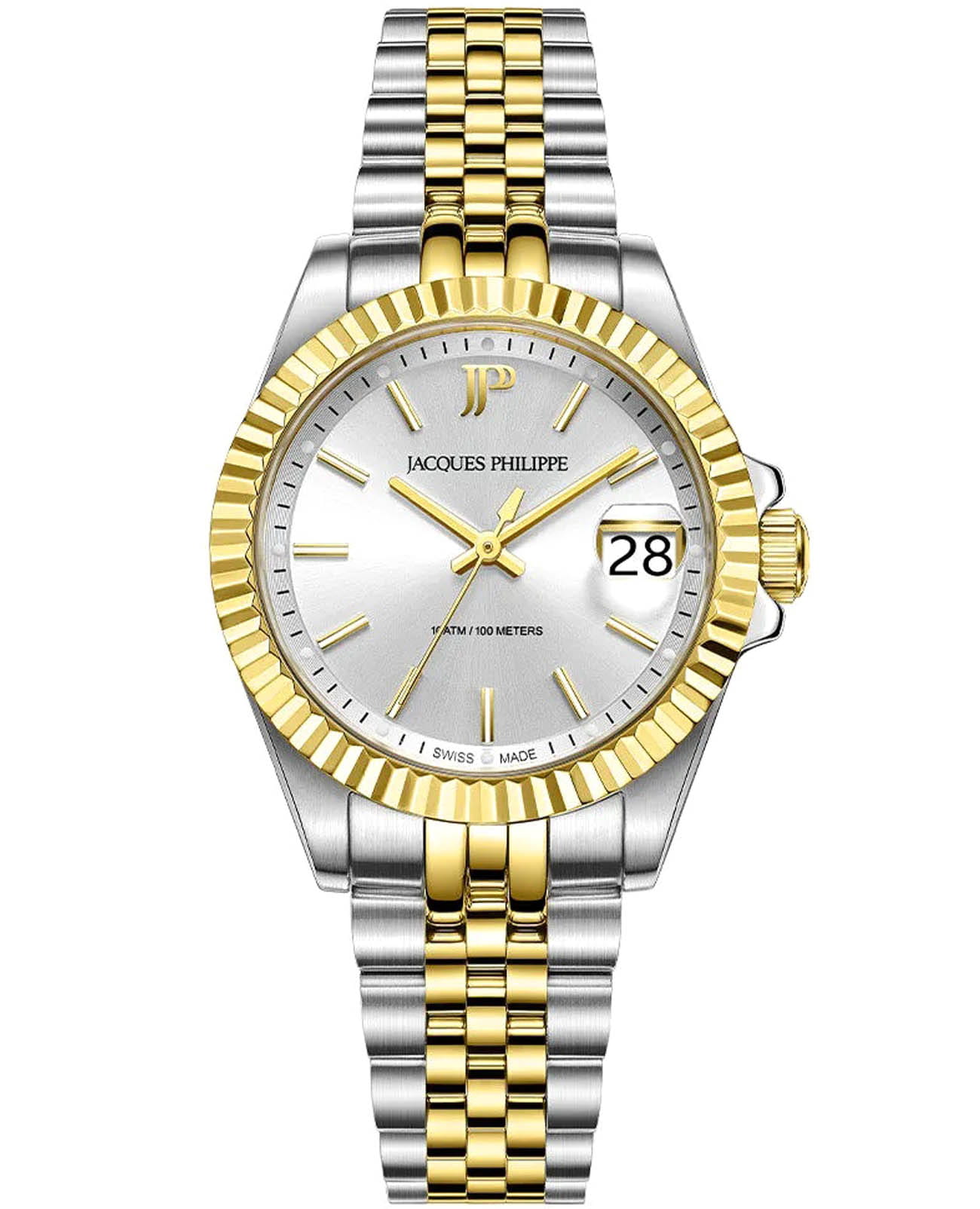 Швейцарские женские часы Jacques Philippe Adastra JPQLS587328YG кварцевый механизм с высокой точностью. Прочное сапфировое стеклоСапфировое стеклоПрочный и надёжный материал из кристалла сапфира синтетического происхождения, характеризующийся особой твёрдостью и устойчивостью к царапинам и повреждениям. устойчивое к царапинам и механическим повреждениям. Циферблат серебристого цвета украшен классическими стрелками и метками гармонично дополняющие общий дизайн модели. Элегантный корпус изготовлен из нержавеющей стали, диаметром 32 мм, что делает их устойчивыми к внешним воздействиям и придает благородный вид. Стальной браслет с частичным IP-покрытиемIP-покрытиеМетод ионного напыления. Демонстрирует повышенную устойчивость к истиранию, окислению и химическим веществам. Под воздействием высокого давления и температуры около 1500°C молекулы металла надёжно соединяются с частицами корпуса часов. на застёжке-бабочке с кнопкамиЗастёжка "бабочка"Такой вид застёжки дополняется предохранителями, помогающими избежать случайного раскрытия браслета. Обладают изящным исполнением. обеспечивает комфортное и безопасное ношение. Неподвижный рифленый безельБезельВнешний ободок, закрепляющий стекло. В спортивных часах так называется поворотное кольцо с делениями на циферблате, выполняет роль таймера – замеряет отрезки времени на шкале. Неподвижный безель – элемент декора. Однонаправленно вращающийся безель на дайверских часах позволяет фиксировать моменты погружения и выныривания на поверхность. с IP-покрытиемIP-покрытиеМетод ионного напыления. Демонстрирует повышенную устойчивость к истиранию, окислению и химическим веществам. Под воздействием высокого давления и температуры около 1500°C молекулы металла надёжно соединяются с частицами корпуса часов. золотистого цвета. Окошко даты находится в положении 3 часа. Класс водозащиты: 100 метров позволит плавать, нырять и заниматься другими водными видами спорта. Эти часы станут идеальным выбором для женщин, ценящих стиль, качество и функциональность.