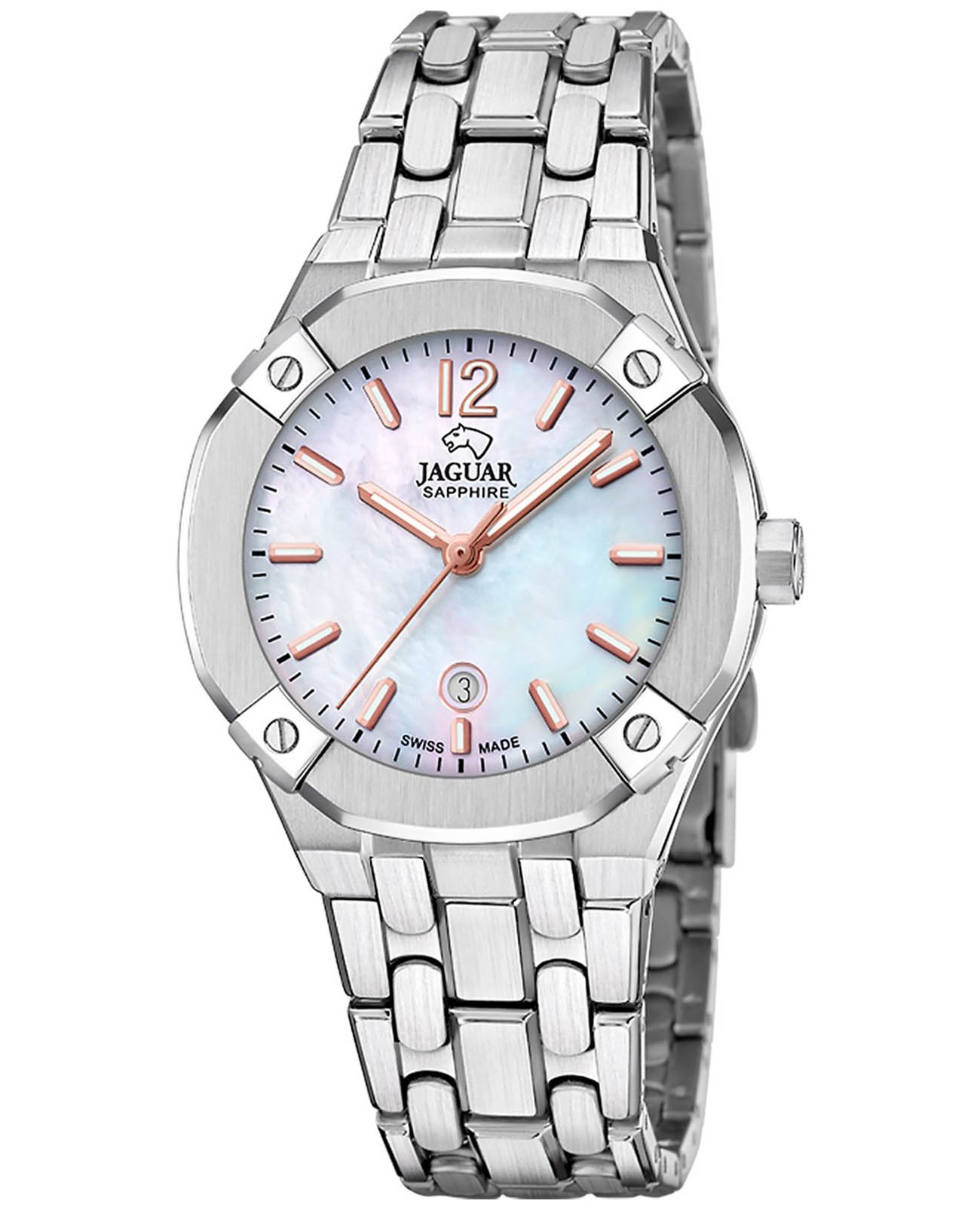 Женские швейцарские часы Jaguar Diplomatic Lady J1016/1. Кварцевый швейцарский калибр Ronda Harley 785. Сапфировое стеклоСапфировое стеклоПрочный и надёжный материал из кристалла сапфира синтетического происхождения, характеризующийся особой твёрдостью и устойчивостью к царапинам и повреждениям. устойчивое к мелким механическим повреждениям. Корпус и браслет часов изготовлены из нержавеющей стали. Стрелки и метки с люминесцентным покрытиемЛюминесцентное покрытиеПозволяет считывать показания времени в темноте. Производители наносят на стрелки, часовые индексы, безель или поверхность циферблата светонакопительный состав, дающий холодное свечение.. Окошко даты находится в положении 6 часов. Класс водозащиты: 100 метров, позволит плавать, нырять и заниматься другими водными видами спорта. Стальной браслет на раскладной застёжкеРаскладная застёжкаТакой тип застёжки используется только на браслетах из металла. Она никогда не раскрывается полностью, происходит разделение на 2 и более частей. Раскладывающая застёжка снизит вероятность потери часов к минимуму..