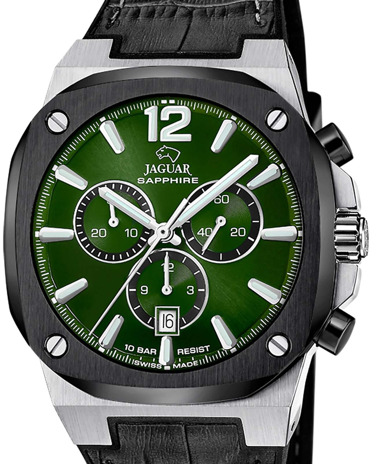 Мужские швейцарские часы Jaguar Rond Carre J1026/5 — это стильное сочетание элегантности и современного дизайна. Корпус из нержавеющей стали диаметром 43 мм идеально сбалансирован и элегантен. Сапфировое стеклоСапфировое стеклоПрочный и надёжный материал из кристалла сапфира синтетического происхождения, характеризующийся особой твёрдостью и устойчивостью к царапинам и повреждениям. с антибликовым покрытием защищает циферблат от царапин и обеспечивает отличную читаемость при любом освещении. Кожаный ремешок на застёжке-бабочке с кнопкамиЗастёжка "бабочка"Такой вид застёжки дополняется предохранителями, помогающими избежать случайного раскрытия браслета. Обладают изящным исполнением. идеально дополняют дизайн часов, обеспечивая комфортное ношение. Стрелки и метки на циферблате имеют люминесцентное покрытиеЛюминесцентное покрытиеПозволяет считывать показания времени в темноте. Производители наносят на стрелки, часовые индексы, безель или поверхность циферблата светонакопительный состав, дающий холодное свечение. позволяющее легко определять время даже в темноте. БезельБезельВнешний ободок, закрепляющий стекло. В спортивных часах так называется поворотное кольцо с делениями на циферблате, выполняет роль таймера – замеряет отрезки времени на шкале. Неподвижный безель – элемент декора. Однонаправленно вращающийся безель на дайверских часах позволяет фиксировать моменты погружения и выныривания на поверхность. с PVD-покрытиемPVDУльтратонкое покрытие наносится в технике вакуумного напыления, сочетает в себе нитрид титана особой прочности со слоем золота или оксида хрома. Несёт в себе декоративную или защитную функцию. черного цвета. Часы обладают впечатляющей водонепроницаемостью до 10 бар (100 метров), что делает их идеальными для плавания, ныряния и погружений с аквалангом. В часах есть функция хронографаХронографФункция позволяет измерять отрезки времени с особой точностью: часы, минуты, секунды. Верным признаком хронографа является наличие на циферблате 3 дополнительных окошек-счётчиков., с помощью которой вы сможете измерять время с высокой точностью.